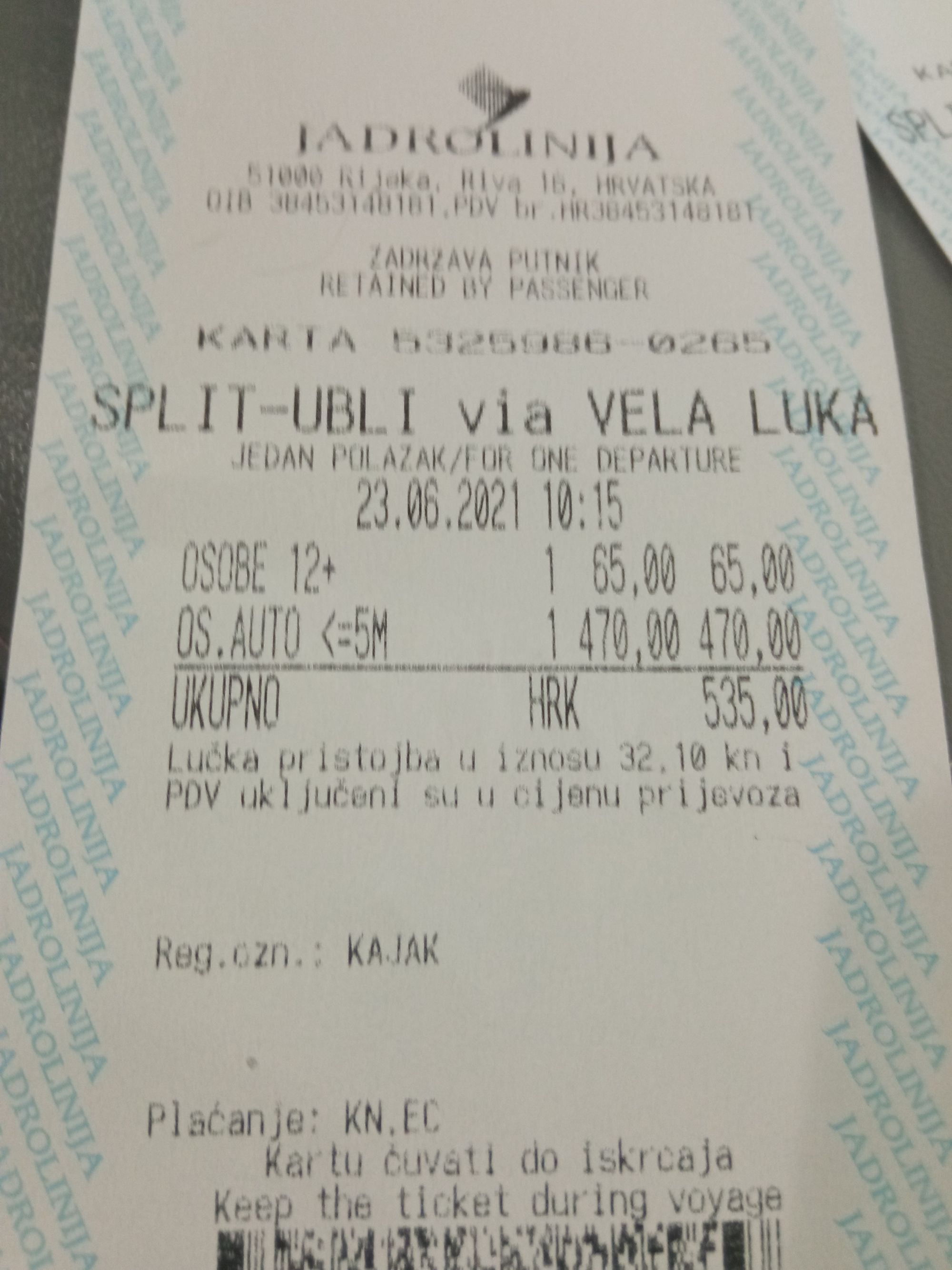 Na kraju, bezobrazni djelatnik trajekta “Korčula”, valjda iz straha da mu inspekcija ne da otkaz jer kajaci nisu istih dimenzija kao bicikl, natjera me da trčim dva puta do prodaje od svjetionika Lukobran u Splitu, gdje me prodaja dodatno novčano oštetila jer mi je na kraju prodala karte za jedan auto i 13 putnika iako je nas u grupi bilo devet i 5 kajaka.