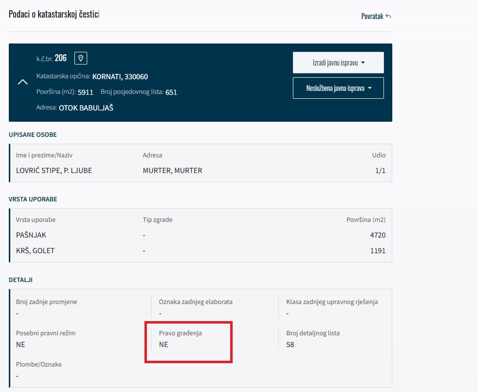 Dapače, u katastru je jasno naznačeno da se na ovoj katastarskoj čestici u vlasništvu Stipe Lovrića iz Murtera, ne smije graditi.