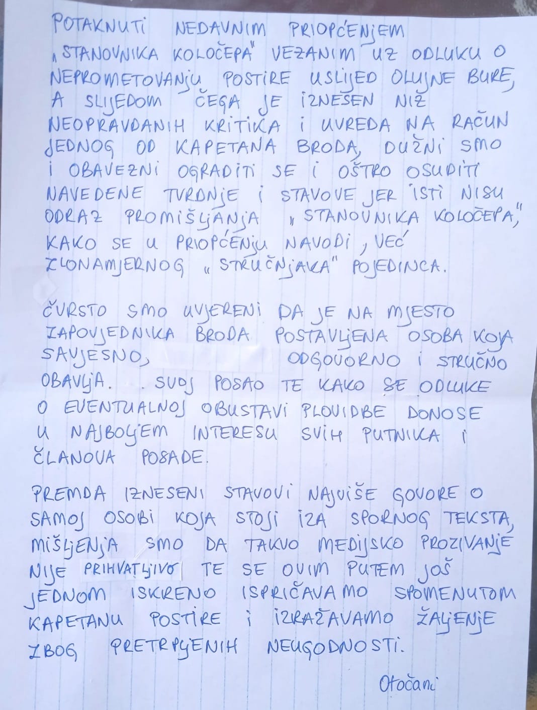 Potaknuti nedavnim priopćenjem "stanovnika Koločepa" vezanim uz odluku o neprometovanju Postire ured olujne bure, a slijedom čega je iznesen niz neopravdanih kritika i uvreda na račun jednog od kapetana broda, dužni smo i obavezni ograditi se i oštro osuditi navedene tvrdnje i stavove jer isti nisu odraz promišljanja "stanovnika Koločepa", kako se u priopćenju navodi, već zlonamjernog "stručnjaka " pojedinca.
