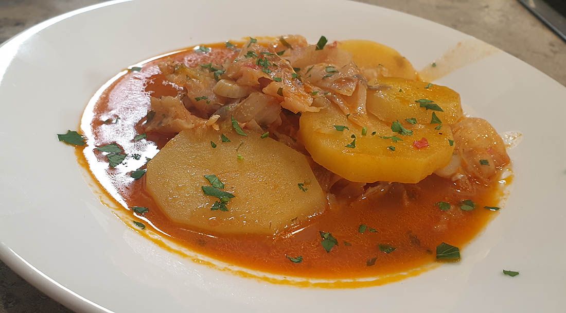 Nakon sto vino izvri, zalijemo temeljcem, pričekamo da provri  i na to dodamo krompir narezan na fete, sol, papar i nasjeckan petrusin. Tekućine mora biti tek toliko da pokrije patate.