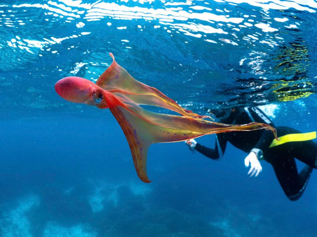 Riječ je o o rodu Tremoctopus koja uglavnom živi u dubokim vodama otvorenog oceana pa je uzbuđenje morskih biologinja bilo tim veće budući da se neobična životinja ponašala prilično opušteno u blizini obale. Ženka neobične hobotnice pravila je društvo dvjema biologinjama punih pola sata, nakon čega je nastavila svojim putem.