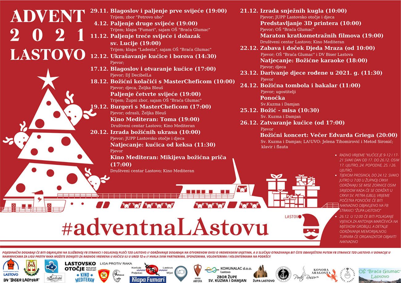 LASTOVO – Bliži se Božić – blagdan u kojem slavimo druge, kada smo spremni dati i primiti ljubav. Božićna čarolija koja je već obuhvatila druge krajeve svijeta osjeća se i na Lastovu, a započela je paljenjem prve svijeće na adventskom vijencu. Kako bi ta čarolija postala opipljiva, na našem najudaljenijem otoku Turistička zajednica Općine Lastovo organizira manifestaciju Advent 2021 (#adventnaLAstovu). Manifestacija je humanitarnog karaktera i ove godine će sav prihod ići za Ligu protiv raka.