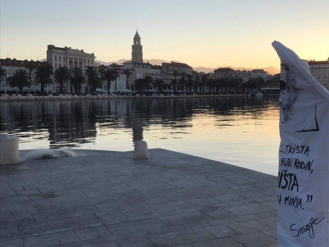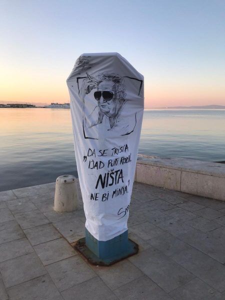 SPLIT – Splitski aktivisti pod nazivom “Šetači kipova na mokrenje” jutros su na splitskoj Matejušci napravili performans. Odlučili su plahtom s likom Miljenka Smoje prekriti fotostup na Matejušci. Naime, radi se o “izumu” mladog HDZ-ovca iz Solina, koji se u eri visokosofisticiranih kamera na mobitelima dosjetio montirati nepomične stupove s kamerama daleko niže rezolucije, a čije je genijalno djelo splitska gradska vlast naručila u tri primjerka, dok je svaki koštao nevjerojatnih 78.667 kuna. Dodajmo ovome da je u lipnju 2019. godine Ministarstvo gospodarstva dodijelilo čak 1.3 miliijuna bespovratnih kuna (!) za prilagodbu fotostupa zahtjevima tržišta, a stupovi su se ubrzo pokvarili i uhvatila ih je korozija.