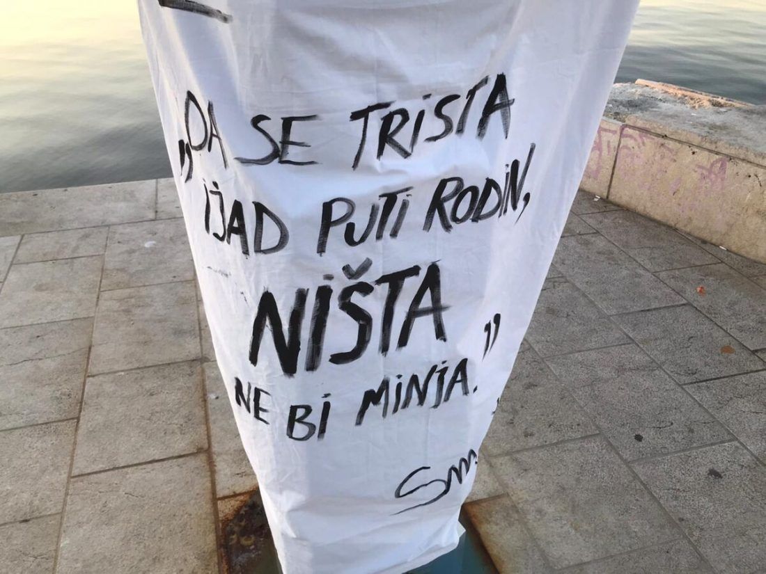 “Šetači kipova na mokrenje” tako su jutros izveli na način da su prekrili fotostup lancunom na kojemu je nacrtan Miljenko Smoje, te poslali sljedeću poruku: