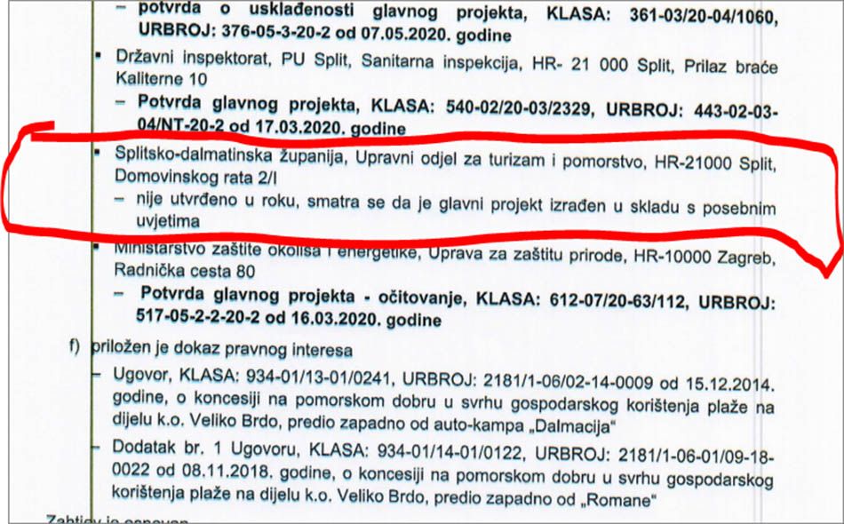 – GRAĐEVINSKA DOZVOLA u kojoj su POSEBNE SUGLASNOSTI od strane Lučke kapetanije i od strane Upravnog odjela za pomorstvo i turizam dobijene tako da se nadležni Čikotić i Čogelja namjerno nisu oglasili jer su znali da ne mogu izdati potvrdu već su je omogućili šutnjom administracije.. pogledajte slikovni prilog