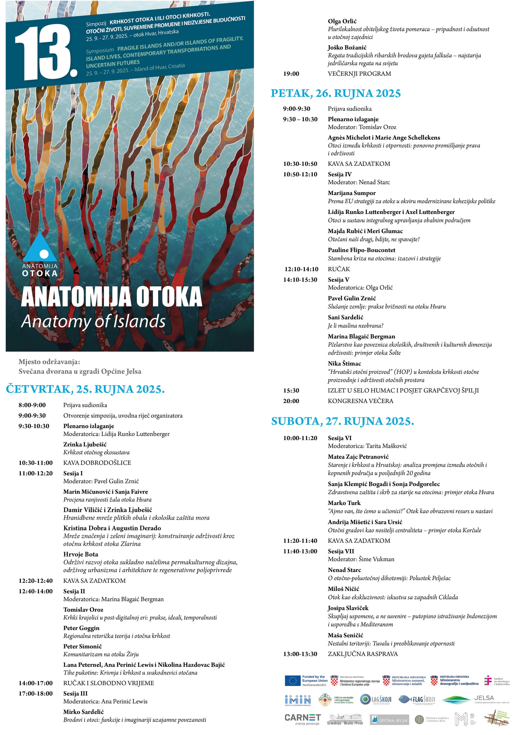Anatomija otoka Krhkost otoka i/ili otoci krhkosti: otočni životi, suvremene promjene i neizvjesne budućnosti održat će se od 25. do 27. rujna 2025. u Jelsi na otoku Hvaru.
