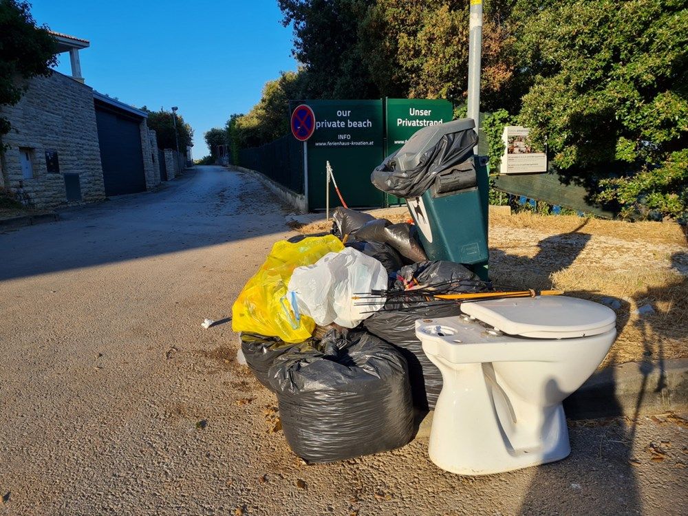 Ista ta “gospoda” redovno pred svojom kućom stavljaju ogradice i plastične lance te time privatiziraju i dio ulice kao privatni parking. I na kraju, nakon što su očistili te za sezonu pripremili svoj “private beach”, a zapravo parcelu uz more, vreće s travom i ostalim otpadom ostavljaju pored male kante na površini pored jedinog parkiralištu iznad obale – pored stubišta za prilaz moru! Zaista lijepa slika, piše Glas Istre.