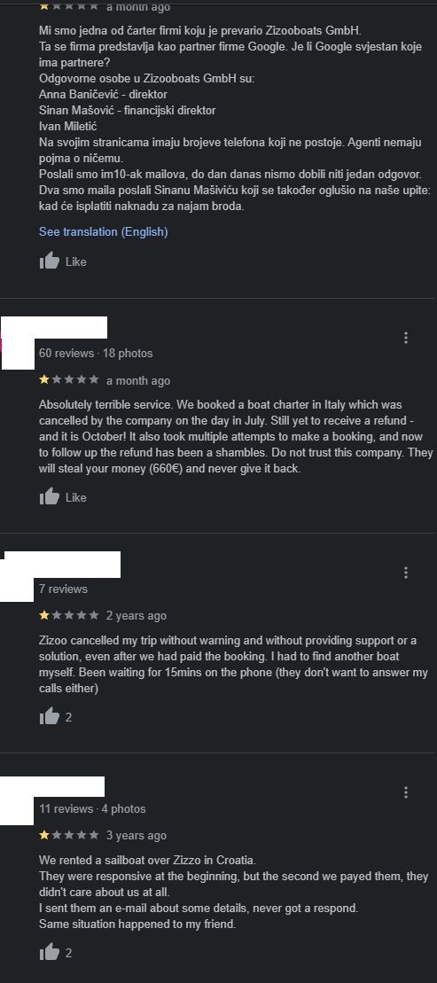 I doista, osim Morskom HR, pet čitatelja kontaktiralo je urednički tim uglednog nautičkog časopisa Yacht.de. Njima se dogodila noćna mora svakog kupca: Neposredno prije najma plovila, saznali su od operatera flote unajmljenih jahti da predujmovi iz Zizooa nisu stigli, da su ugovori stoga raskinuti i da će brodove primiti samo ako ih ponovno plate na licu mjesta.