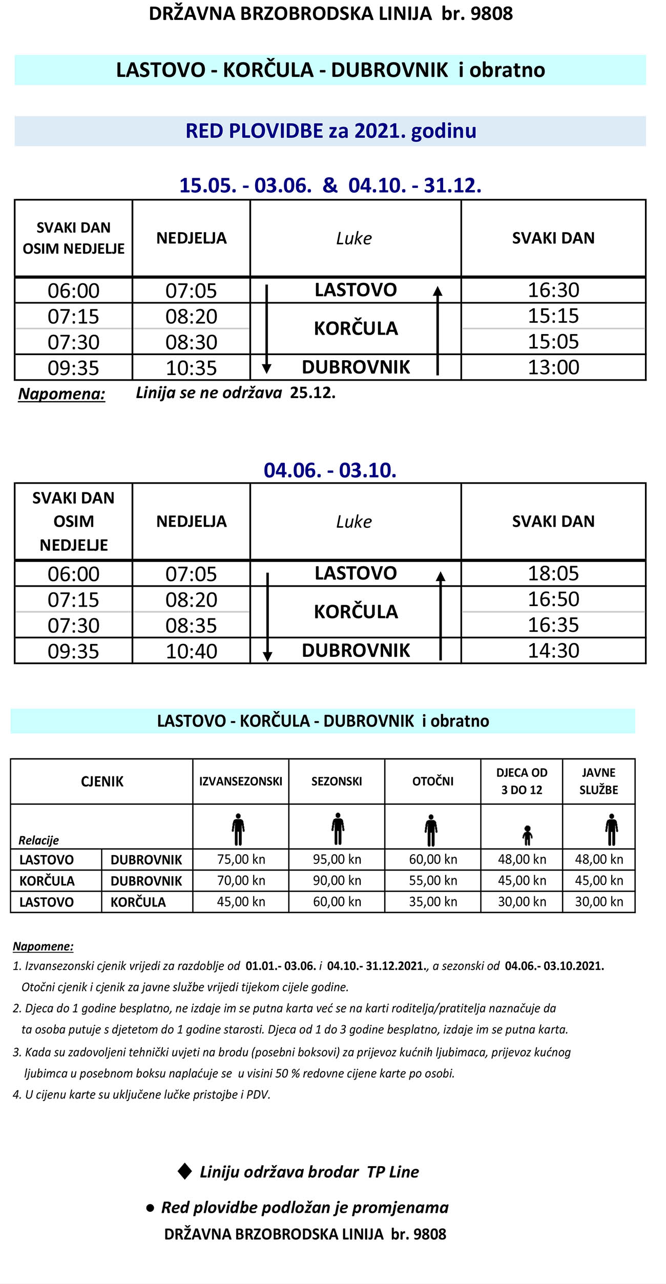 Donosimo i plovidbeni red nove linije, uz napomenu kako prvi dan polaska broda valja pomaknuti na 24. svibanj u mjesto 15. svibnja kako stoji u vrhu reda: