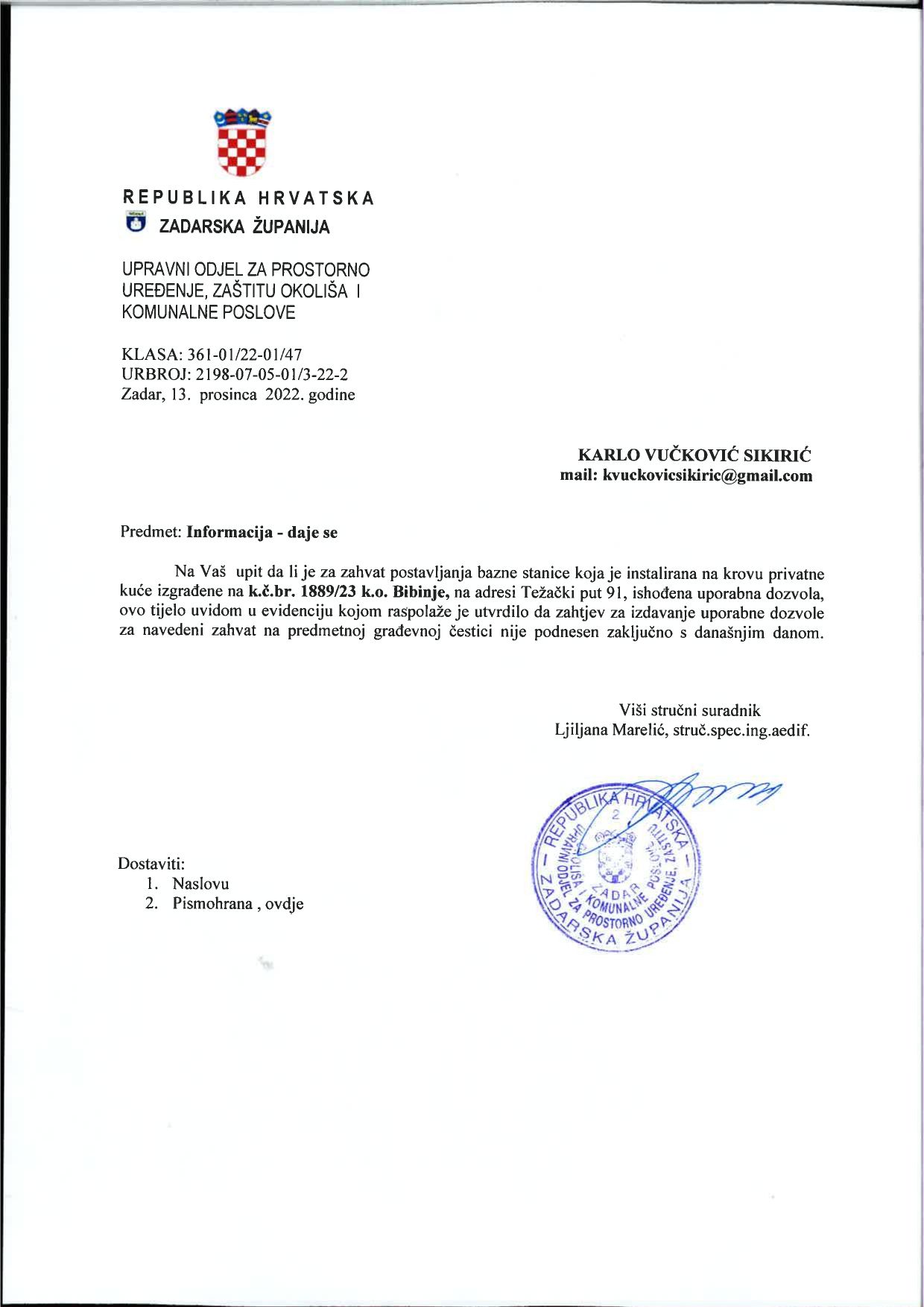 Teleoperatera A1 pitali smo Kako je bazna stanica dobila struju i ima li uporabnu dozvolu? Prosvjednici kažu da imaju dozvolu za rad od Ministarstva zdravstva ali za gospodarsku zonu (Marina Dalmacija), dok je naselje gdje su postavljene BS, zona posebne osjetljivosti. Imaju li dokument koji potvrđuje suprotno?