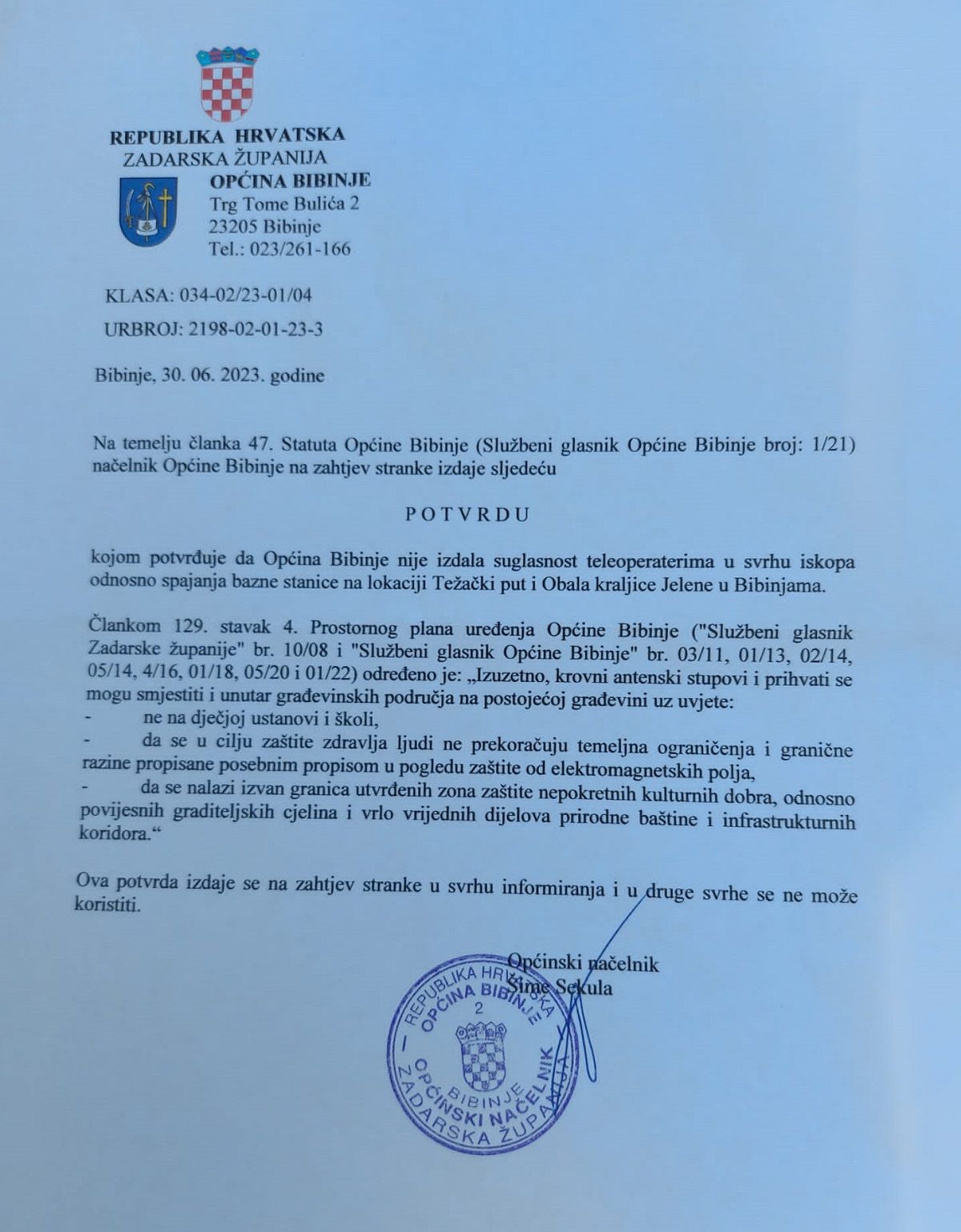 - Cijela priča počinje 2018. kada Ivan Šimunić obnaša funkciju predsjednika vijeća općine Bibinje i tada potpisuje akt (u prilogu je) pravila o postavljanju baznih stanica, gdje se zabranjuje postaviti stanice na vrtić i školu. Zašto ako nema rizika?