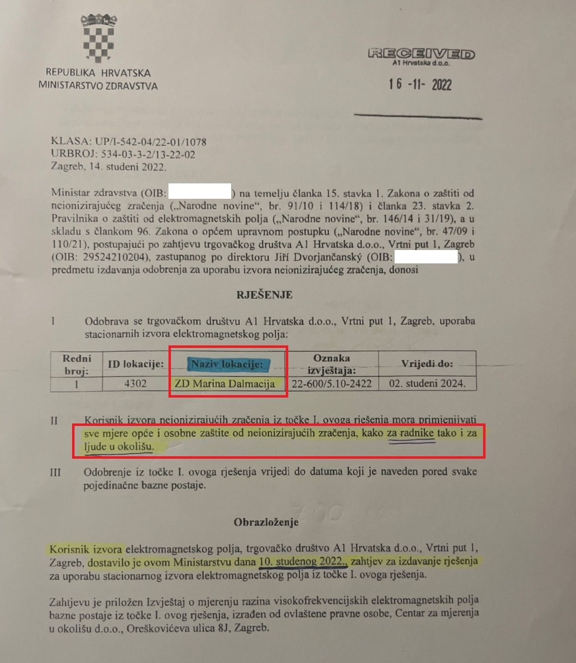 A u dozvoli piše da: "A1 ima pravo koristiti izvor elektromagnetskog polja ALI mora primjenjivati sve mjere opće i osobne zaštite od neionizirajućeg zračenja, kako za radnije tako i za ljude u okolišu."