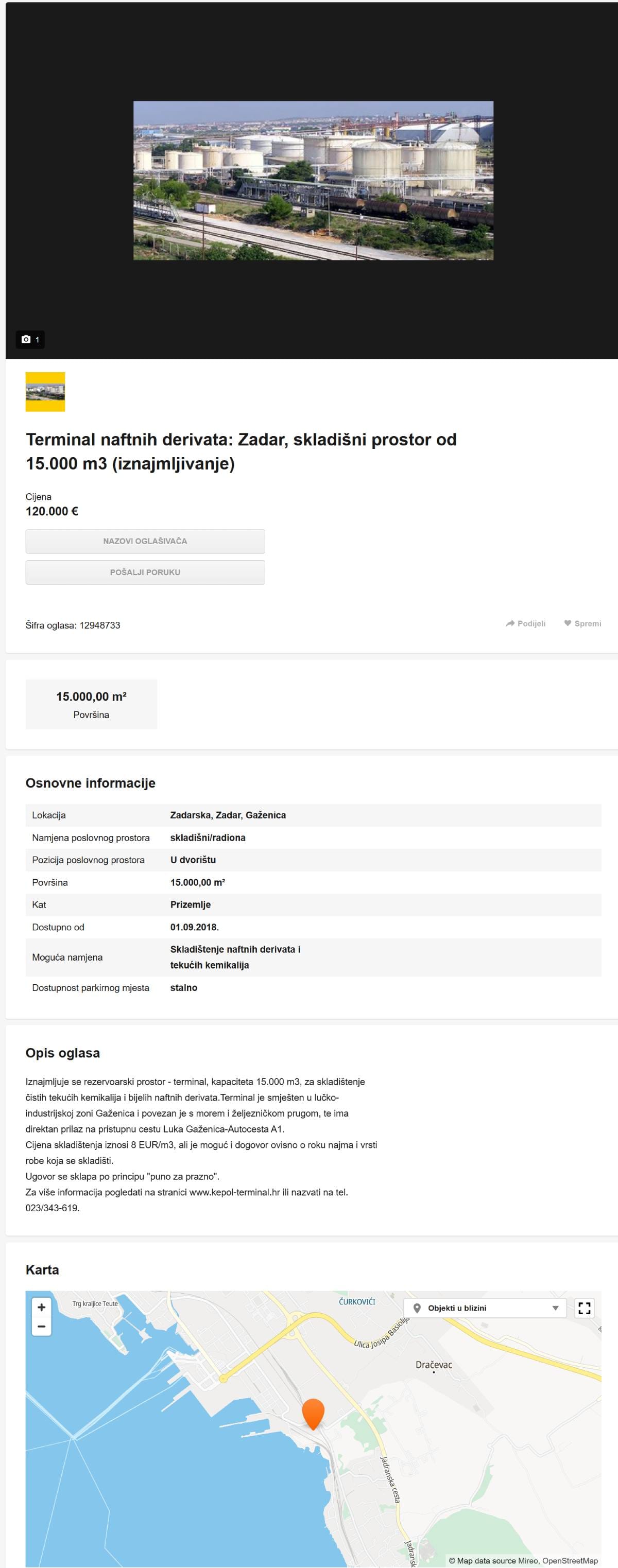 "Iznajmljuje se rezervoarski prostor - terminal, kapaciteta 15.000 m3, za skladištenje čistih tekućih kemikalija i bijelih naftnih derivata.Terminal je smješten u lučko-industrijskoj zoni Gaženica i povezan je s morem i željezničkom prugom, te ima direktan prilaz na pristupnu cestu Luka Gaženica-Autocesta A1.