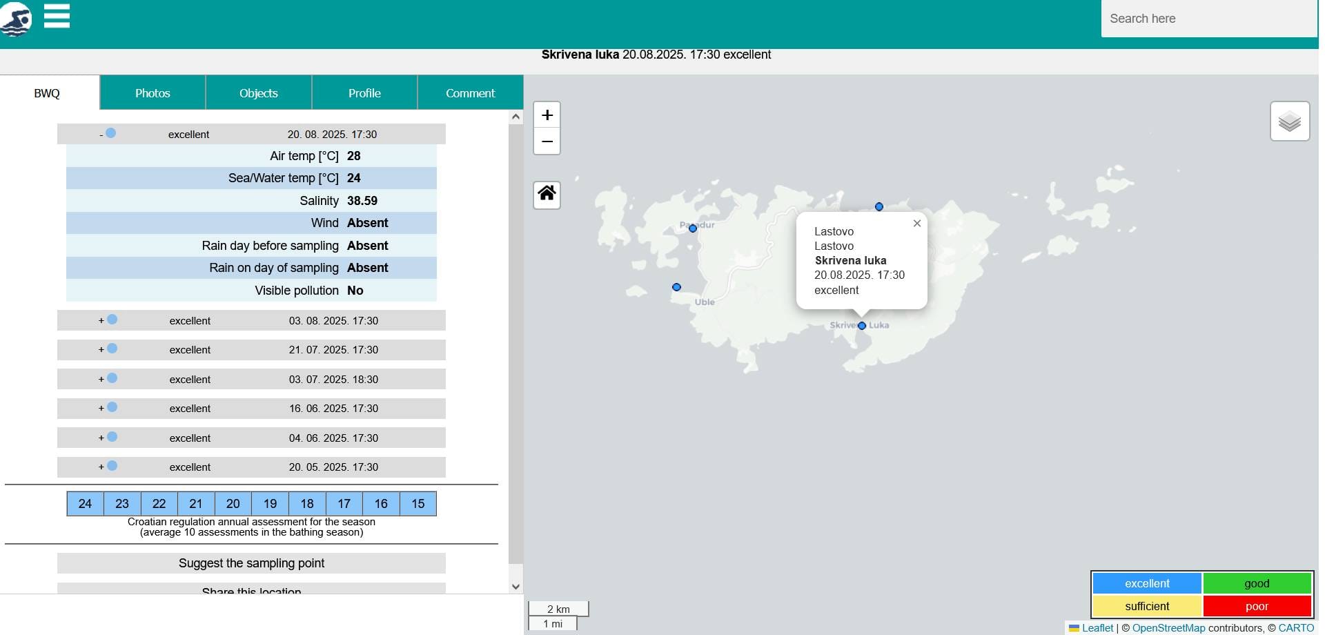 No čitateljica se nema razloga brinuti, barem ako je suditi po znanstvenim podacima, odnosno izmjerama Instituta za oceanografiju i ribarstvo, gdje je na sve četiri referentne točke mjerenja, kvaliteta mora na otoku Lastovu izvrsne kvalitete.