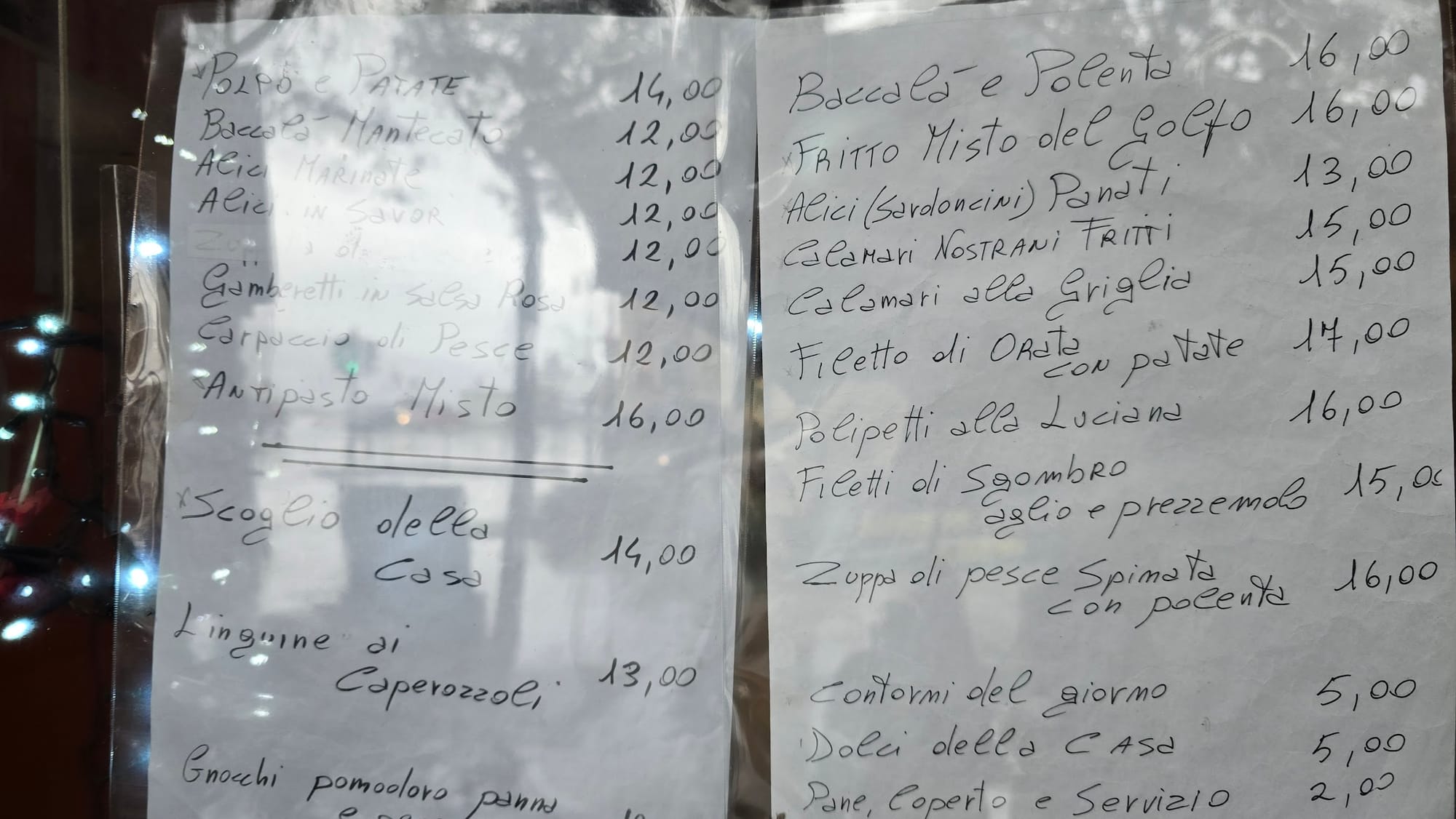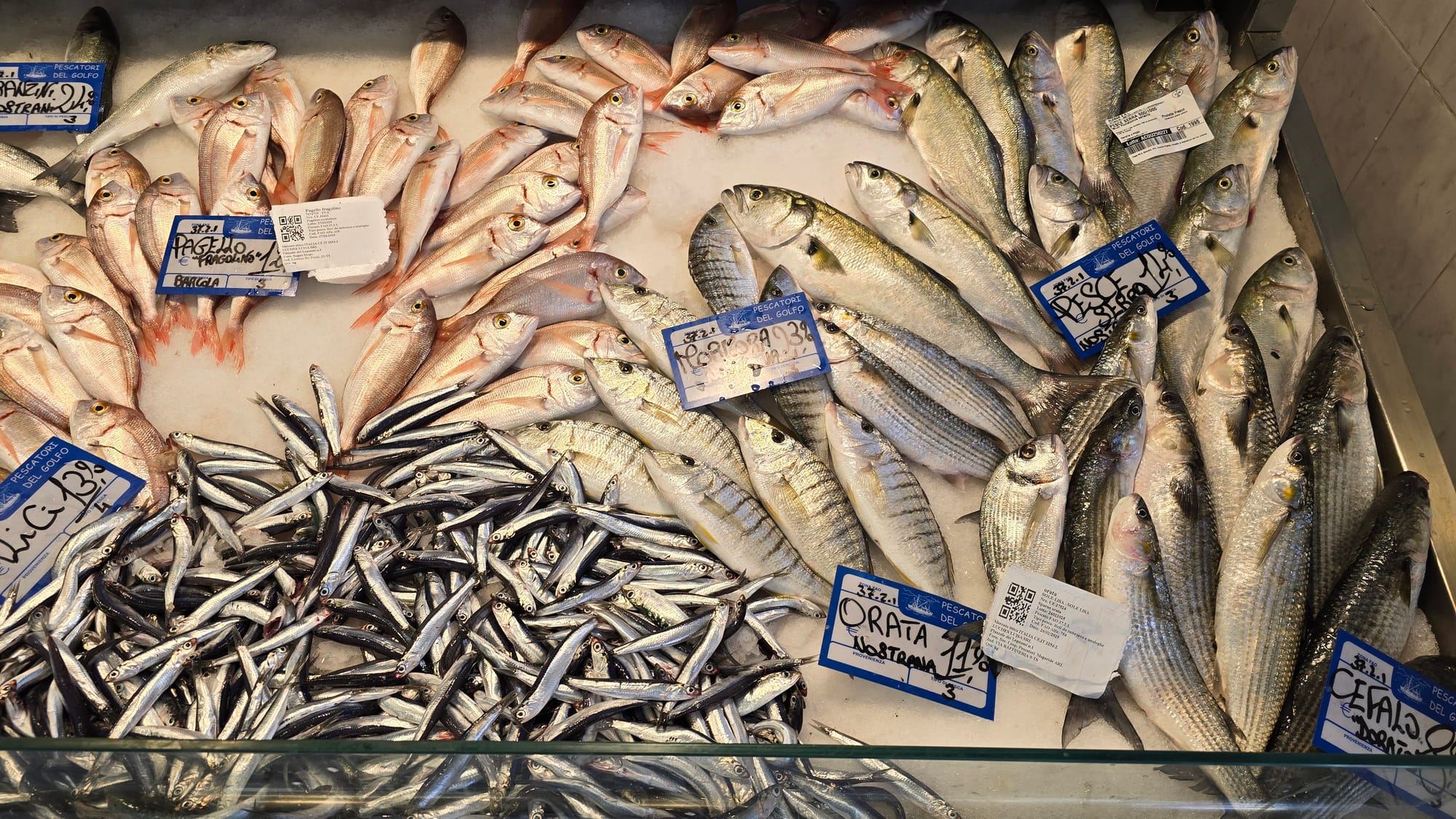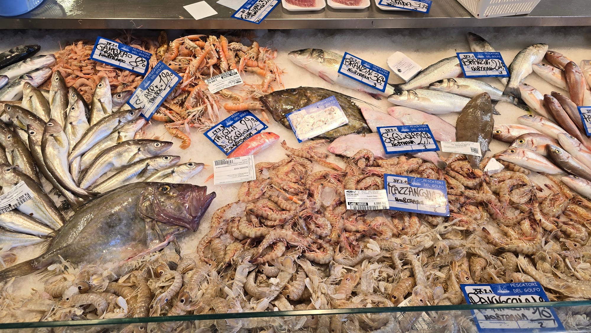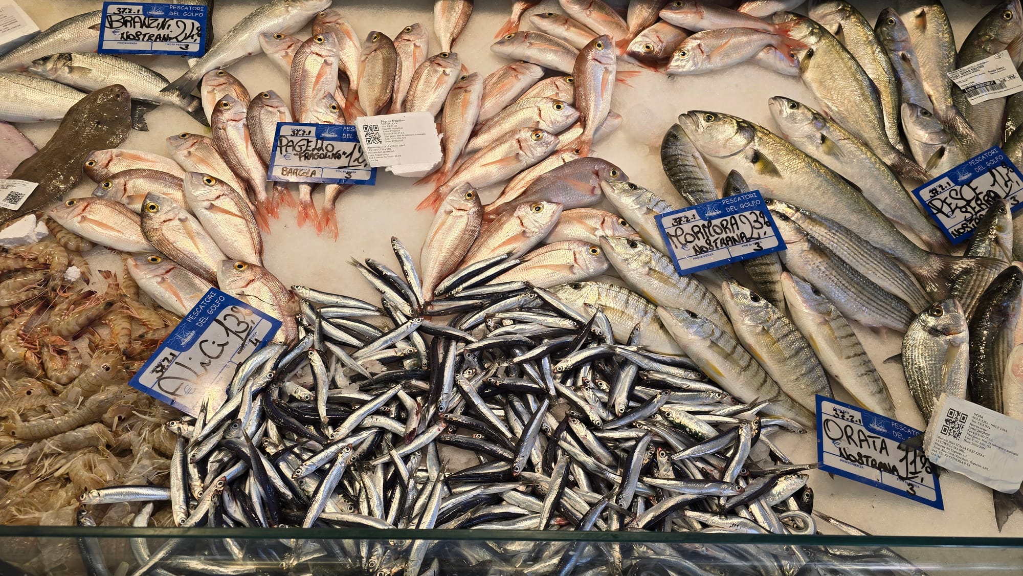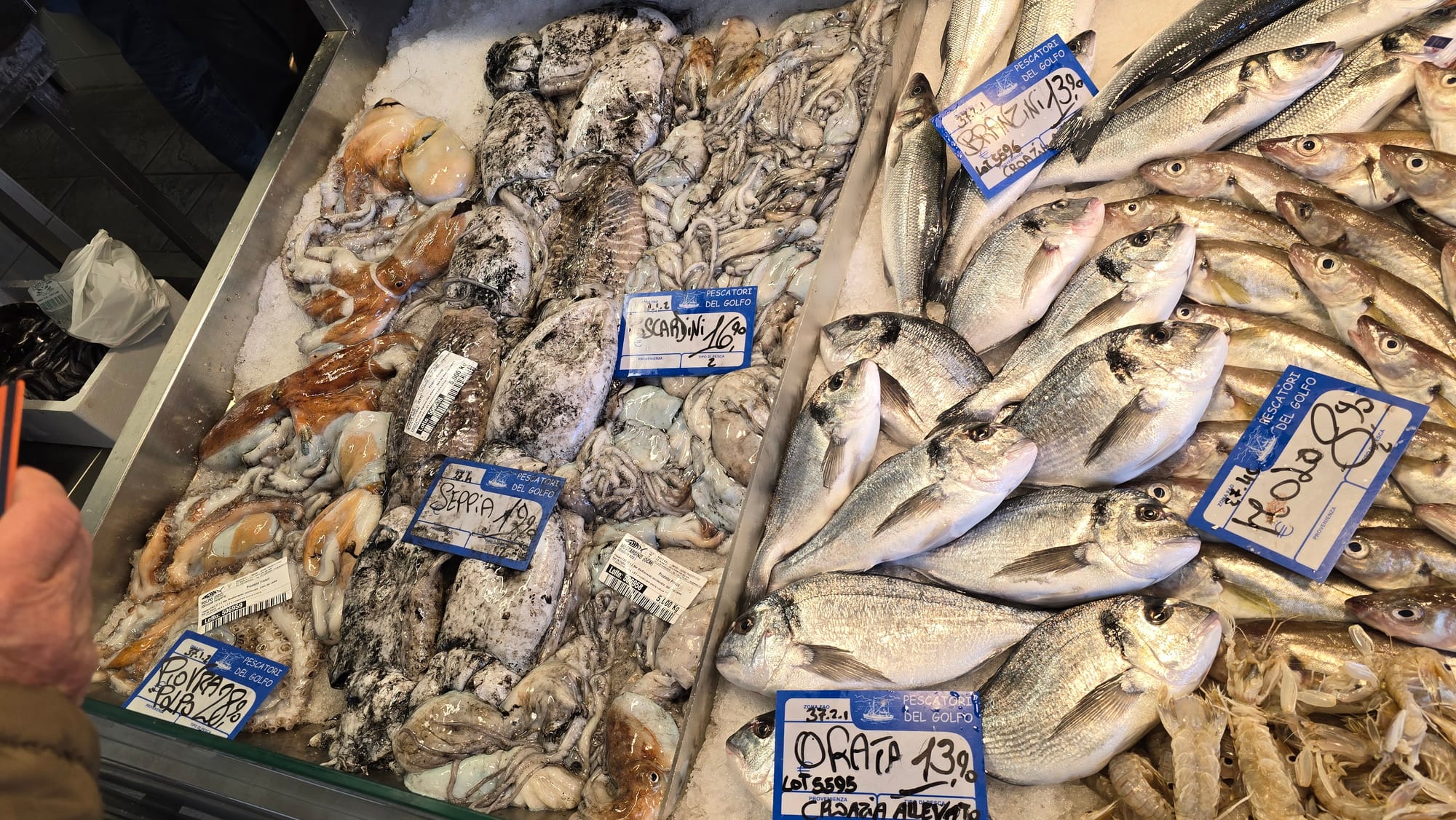 U Trstu smo najprije svratili u jednu od ribarnica i naišli na sljedeće cijene: Sipa se prodaje za 19.90 EUR, hobotnice za 28,90, orada iz uzgoja za 13,90, a toliko koštaju i brancini, mol ili oslić 8,90, a po istoj cijeni prodaju se i gamberi, dok su škampi 19,90. Cipli su 8,90, trlje kamenarke 29,90, a divlji brancini od 24,90 do 36,90 EUR. Pagar se cijeni po 12, a inćuni su čak 13,90 EUR.