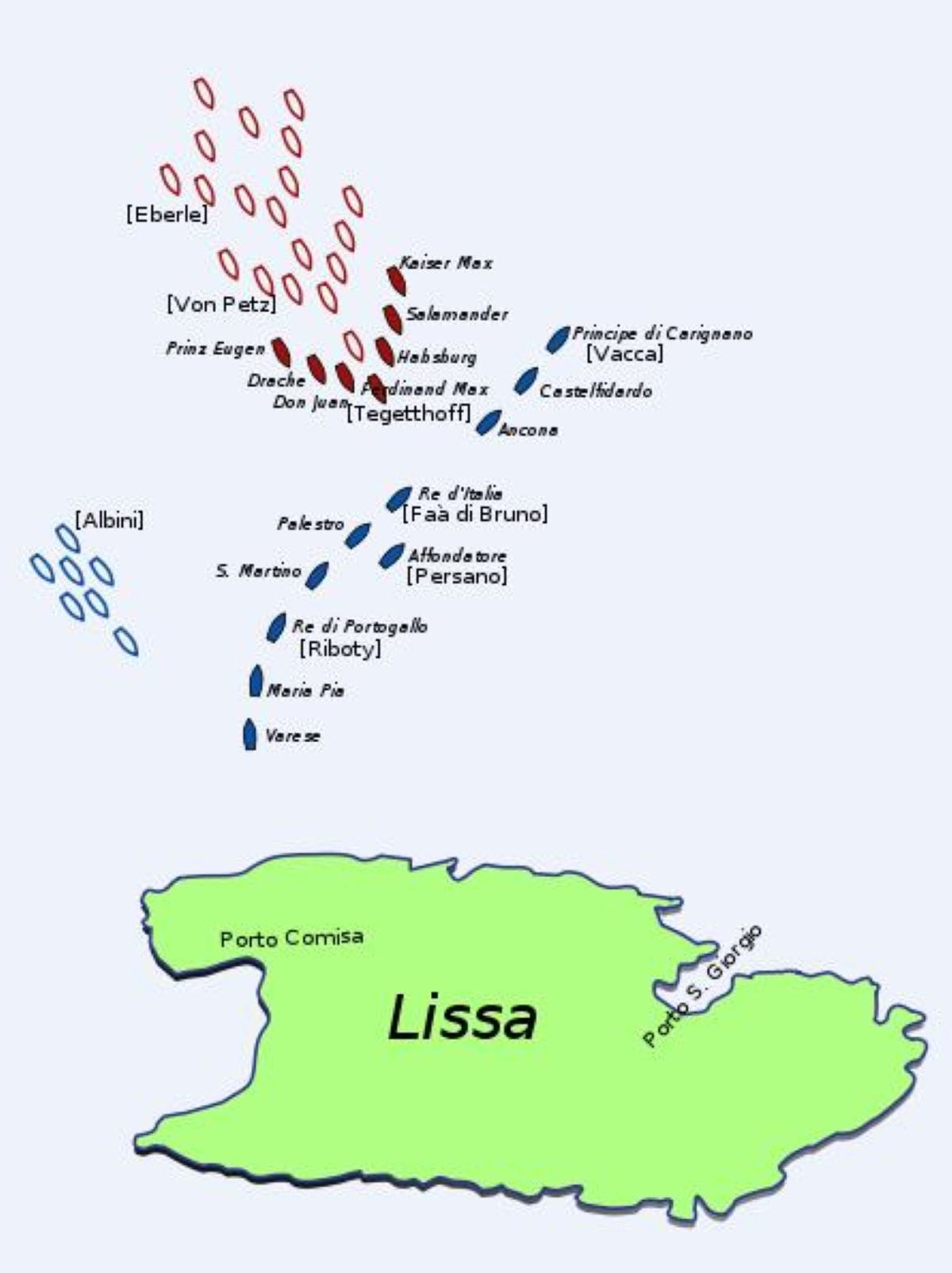 Nakon neuspješnih pokušaja iskrcavanja, talijanska je flota 20. srpnja prekinula izravni napad na otok i pripremila se za dolazak austrijske mornarice. Tegetthoff je išao direktno prema jačem protivniku s 27 brodova (uključujući sedam oklopnjača). Austrijanci su upotrijebili taktički klin i nastojali izbjegavati topničku paljbu, ušavši u blisku borbu i koristeći kljunove brodova za proboj, što je bila taktika iz antičkih vremena.