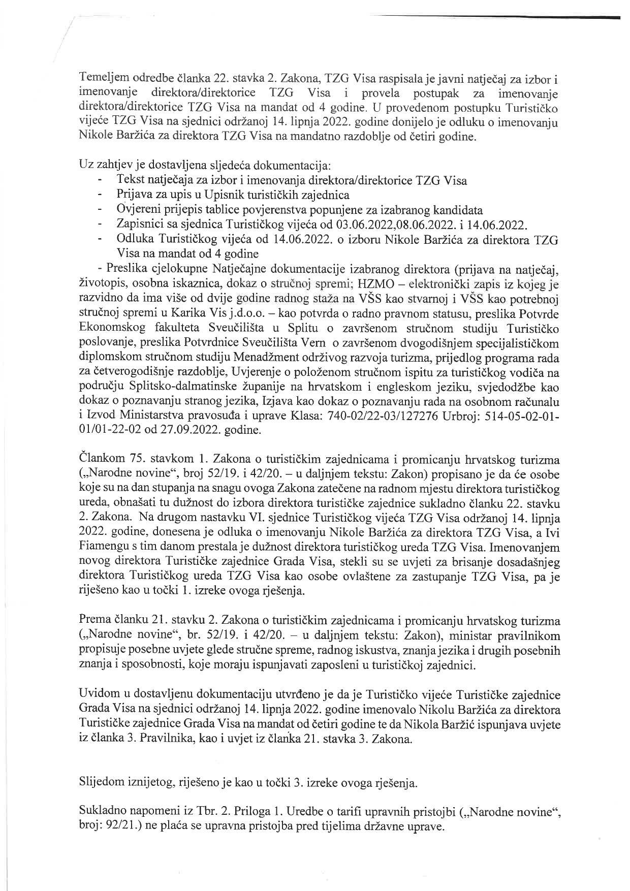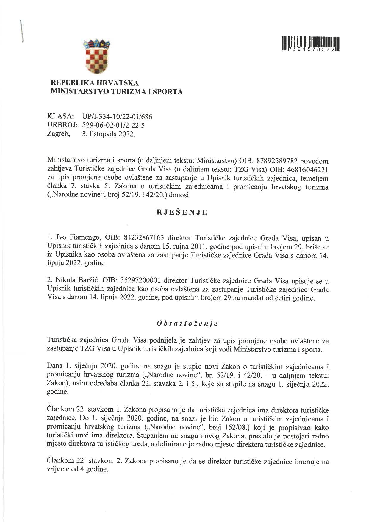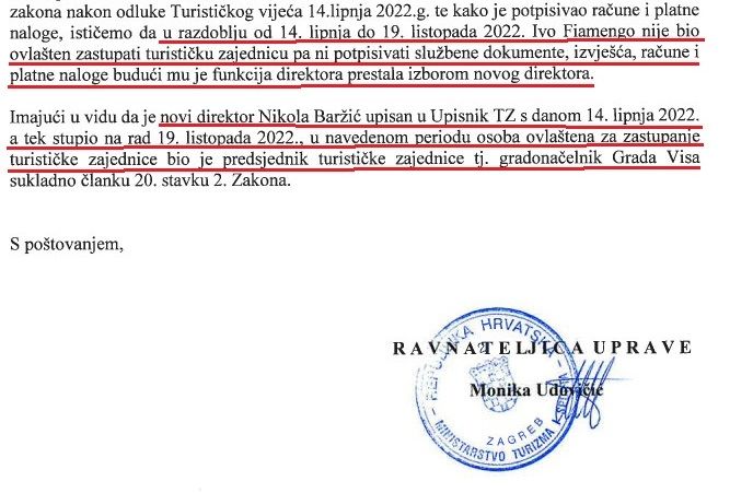 Fiamengo je, kaže Baržić, u međuvremenu do prestanka njegovog radnog odnosa ostao biti radnikom Turističke zajednice, no ne više i direktor i tu je ključna razlika. Pa, iako se Fiamengo u prethodnom obraćanju našoj redakciji pozvao na Odluku turističkog vijeća u kojem svoju dužnost smije obnašati do 8. studenog 2022. godine, jedan drugi dokument kojeg potpisuje ravnateljica Uprave za sustav turističkih zajednica, kategorizaciju i pravne poslove, Monika Udovičić, kaže da Fiamengo nije bio ovlašten zastupati turističku zajednicu, niti pospisivati dokumente ili platne naloge.