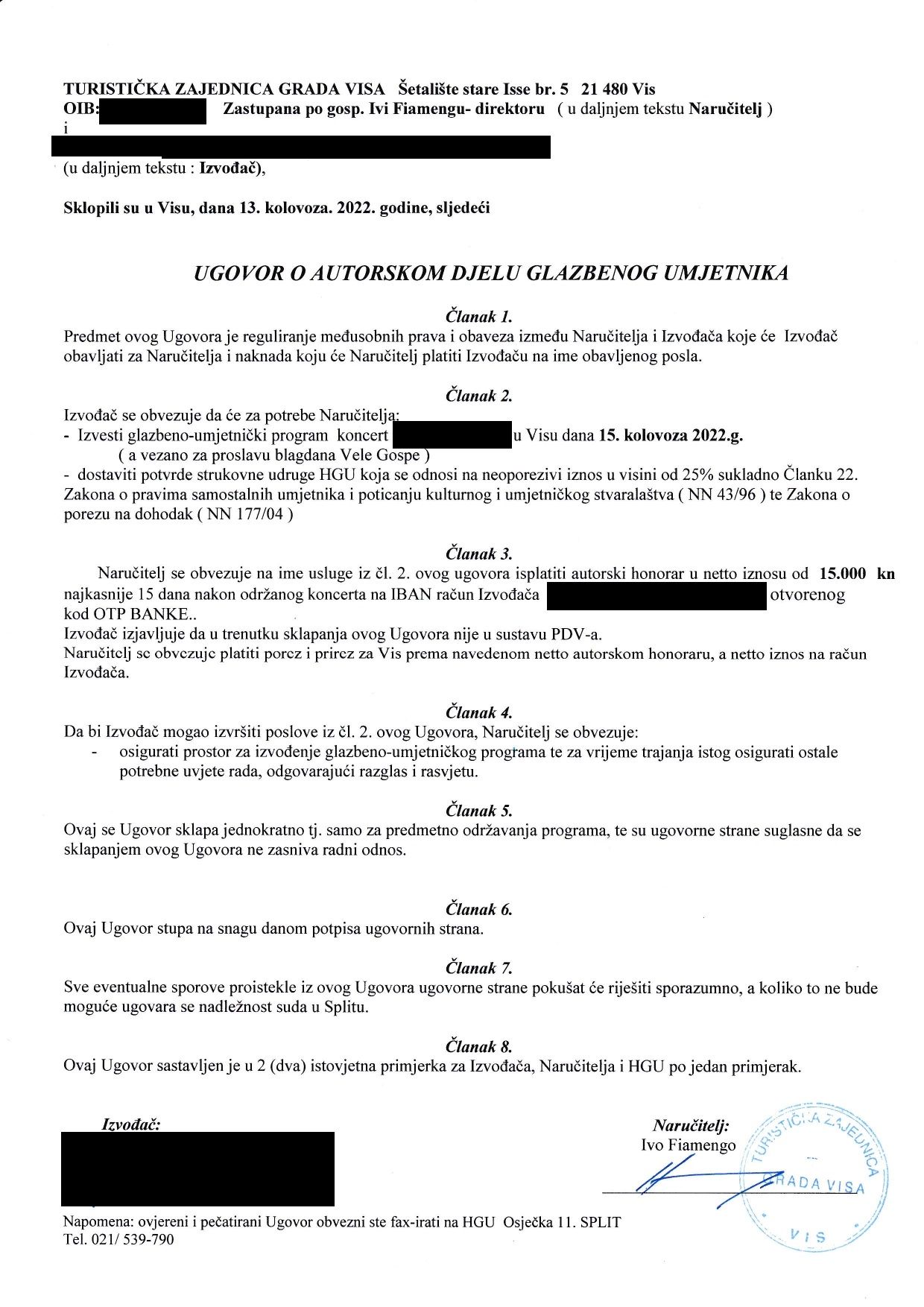 - Gospodin kojem je isplaćeno 4 puta u 2022. godinu po 15 tisuća kuna za glazbeni nastup, nije uopće glazbenik, nego tonac koji spaja žice. Nikad nije održao koncert za dan Vele Gospe u Velom selu ili igdje na otoku Visu tog dana. Bila je samo pjevana misa od svećenika i to je to! Ovaj se nije popeo na nikakvu binu, niti je išta održao. Samo zbog tog jednog računa bi bilo dovoljno da se pokrene nešto. Imam i račune još jednog glazbenika koji svira u kvartetima, a umjesto da novac ide svakome od glazbenika, sve je išlo tom jednom koji je ostalim glazbenicima ilegalno davao novac na ruke. Ovo je sto posto tako, jer mi je to potvrdio i ZAMP. Novac se koristio za prijatelje g. Fiamenga koji su danima besplatno ljetovali u hotelu, imam također službena putovanja gdje g. Fiamengo u hotelu boravi sa svojom ženom na trošak TZ-a, putovanje u Osijek od 19.000 kn, troškove reprezentacije koji su nerealno veliki za jednu malu TZ čiji je godišnji proračun 250.000 €. Kao što sam naveo samo za 2022.g imam više fiktivnih ugovora za glazbene nastupe - kaže Baržić.