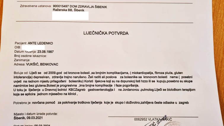 Osim što boluje od kronove bolesti i često krvari, dok je radio u šibenskoj Tvornici lakih metala, zaradio je profesionalno oboljenje, fibrozu pluća. A kao da ni to nije dosta, boluje još od srčanog miokarda miopatije i celijaklije. U TLM-u je poput ostalih radnika trebao dobiti otpremninu, ali, kako kaže, nije je dobio…