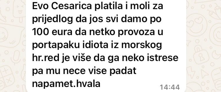 - Evo Cesarica (op.a. ime broda) platila i moli za prijedlog da još svi damo po 100 eura, da netko provoza u portapaku (op.a. = prtljažniku) idiota iz Morskog.hr. Red je više da ga neko istrese, pa mu neće više padat na pamet. Hvala - objavio je jedan od njih i WhatsApp grupi Brodari na Jadranu, nakon čega doznajemo i kako se s inicijativom složilo čak desetak sudionika ove interne komunikacije, od kojih je jedna od poruka glasila, citiram: