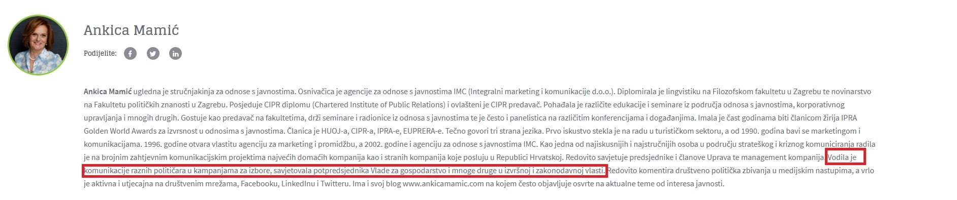 "Redovito savjetuje predsjednike i članove Uprava te management kompanija. Vodila je komunikacije raznih političara u kampanjama za izbore, savjetovala potpredsjednika Vlade za gospodarstvo i mnoge druge u izvršnoj i zakonodavnoj vlasti", stoji između ostalog u njenom životopisu, objavljenom na stranici PR agencije Mirakul, za koju također radi.