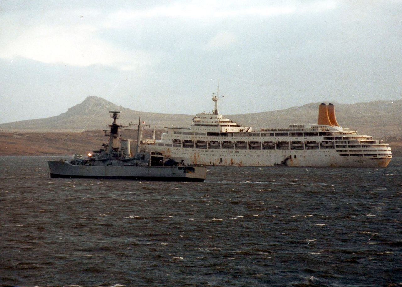 U ratu koji je 1982. izbio na Malvinskim/Falklandskim otocima bilo je jasno da ga je Britanija na tako velikoj udaljenosti mogla dobiti samo masovnim pomorskim transportom svojih vojnih potencijala, pa su uz brodove Kraljevske ratne mornarice (Royal Navy) za taj posao rekvirirani kruzeri Canberra, Queen Elizabeth 2 i Uganda. Canberra je prekinula krstarenje Sredozemljem i povučena je u Southampton odakle je nakon dogradnje tri helikopterske platforme odmah upućena na ratište. Po dolasku na Malvine 21. svibnja 1982. naređeno je iskrcavanje njenih trupa u zaljevu San Carlos, a od stalnih argentinskih zračnih i topničkih napada branile su ga jake mornaričke snage. Na sreću, u ovoj nadasve riskantnoj operaciji, Canberra nijednom nije bila pogođena. Kako je moguće potapanje broda Queen Elizabeth 2 moglo imati dodatne negativne političke konotacije, odlučeno je da se ona ne prepusti ovako rizičnoj operaciji pa je na otvorenom oceanu vojska s nje prekrcana na Canberru.