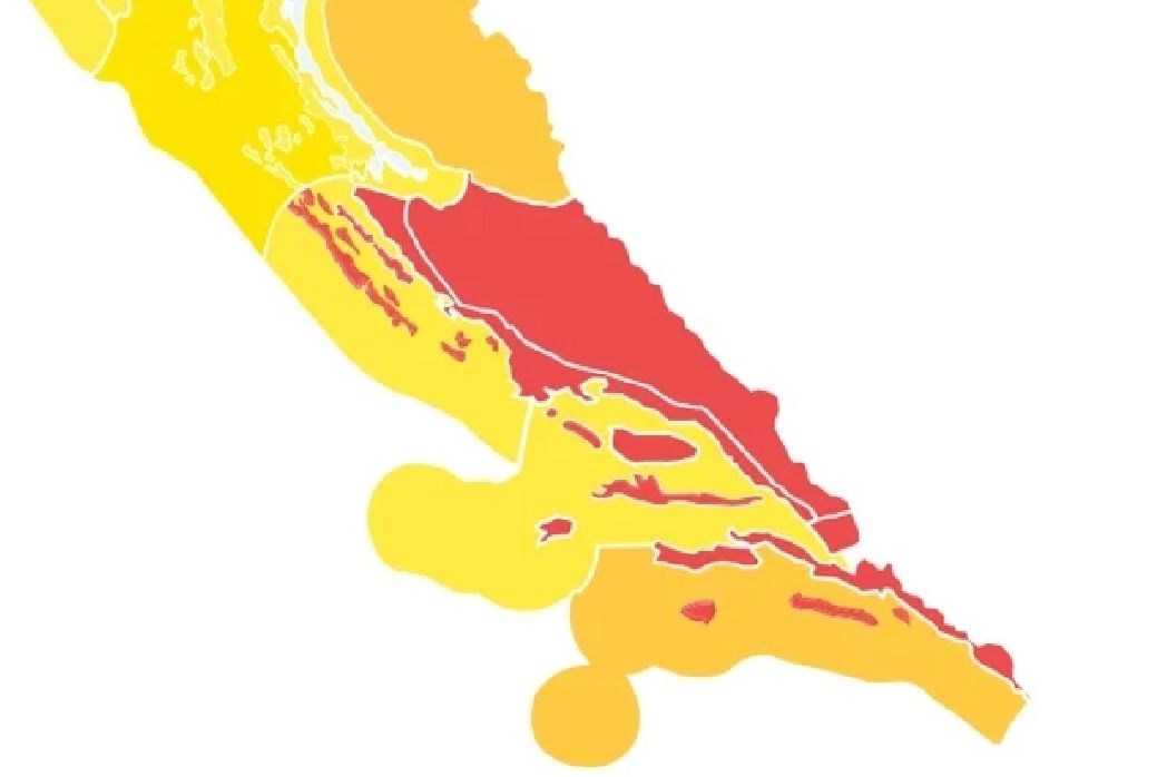 Narančasto upozorenje na nevrijeme je za u regiji Gospić (uglavnom Lika) mjestimice izraženi pljuskovi i grmljavina uz moguće urbane i bujične poplave, a duž Jadrana lokalno i tuču.