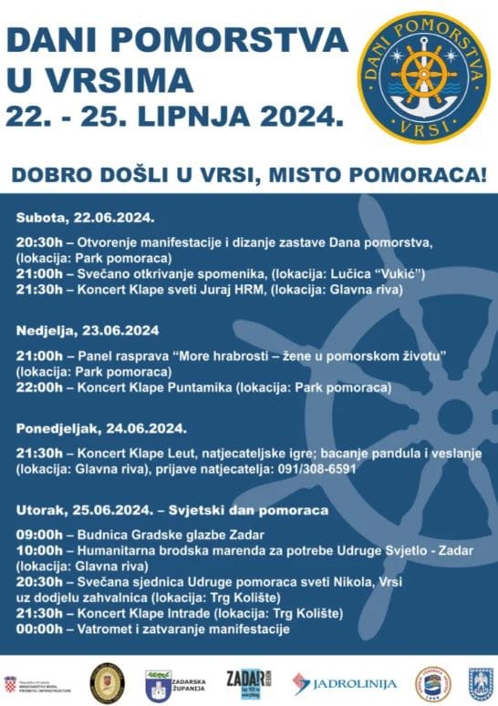 Već treću godinu zaredom, od 22. do 25. lipnja, Vrsi će postati središte pomorske tradicije i kulture kroz manifestaciju Dani pomorstva. Organizaciju ove značajne manifestacije potpisuju Udruga pomoraca Sv. Nikola Vrsi, Turistička zajednica Vrsi i Općina Vrsi, uz pokroviteljstvo Ministarstva mora, prometa i infrastrukture Republike Hrvatske, Jadrolinije, Sindikata pomoraca Hrvatske, Zadarske županije i Turističke zajednice grada Zadra.