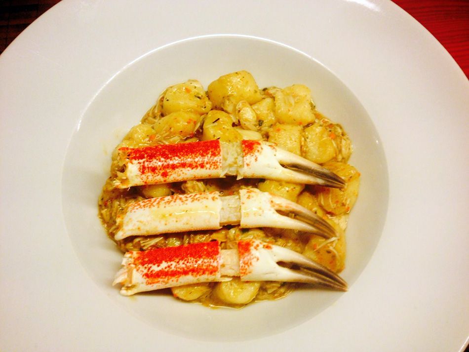 U tavi popržiti sitno sjeckani češnjak, peršin i moždinu rakovice s jajima, podliti vinom. Dodati meso rakovice i dinstati 5 min. Sotirati s kuhanim njokima te servirati.