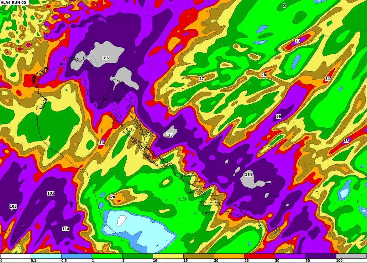 Na Jadranu će, osobito u srijedu puhati jako, ponegdje i olujno jugo i južni vjetar (srednja brzina vjetra od 40 do 70 km/h), a uz premještanje frontalnog poremećaja i jugozapadnjak te sjeverozapadnjak. Udari vjetra lokalno mogu biti i oko 100 km/h (Slika 3). S ozbirom na visoke temperature mora koje pogoduju razvoju grmljavinskih oluja još se jednom upozorava na mogućnost obilnih oborina i poplava.