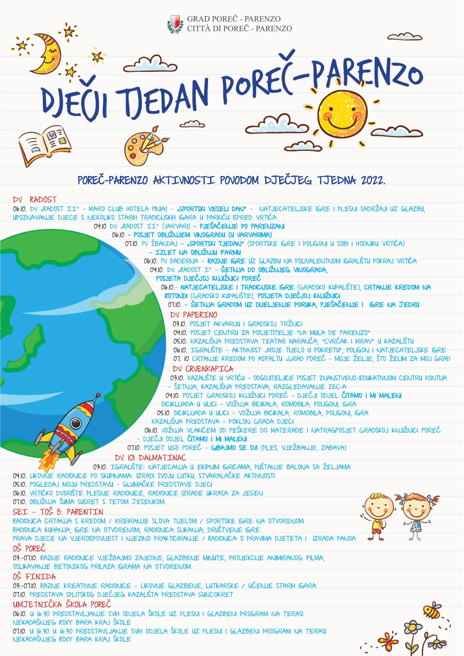 Dječji tjedan donijet će razne aktivnosti i za porečke mališane. Održat će se tradicionalni posjet gradonačelnika svim porečkim prvašićima uz poklon za učiteljice te prigodne majice za sve. U srijedu, 5. listopada više od 420 djece i to učenika prvih razreda svih porečkih osnovnih škola i djeca u dobi 5 i 6 godina iz svih dječjih vrtića, u kazališnoj će dvorani pogledati novu predstavu „Cvrčak i mrav“ pulskog Teatra Naranča, svaka u trajanju oko pola sata, koja je poklon Grada Poreča-Parenzo djeci za ovaj tjedan.