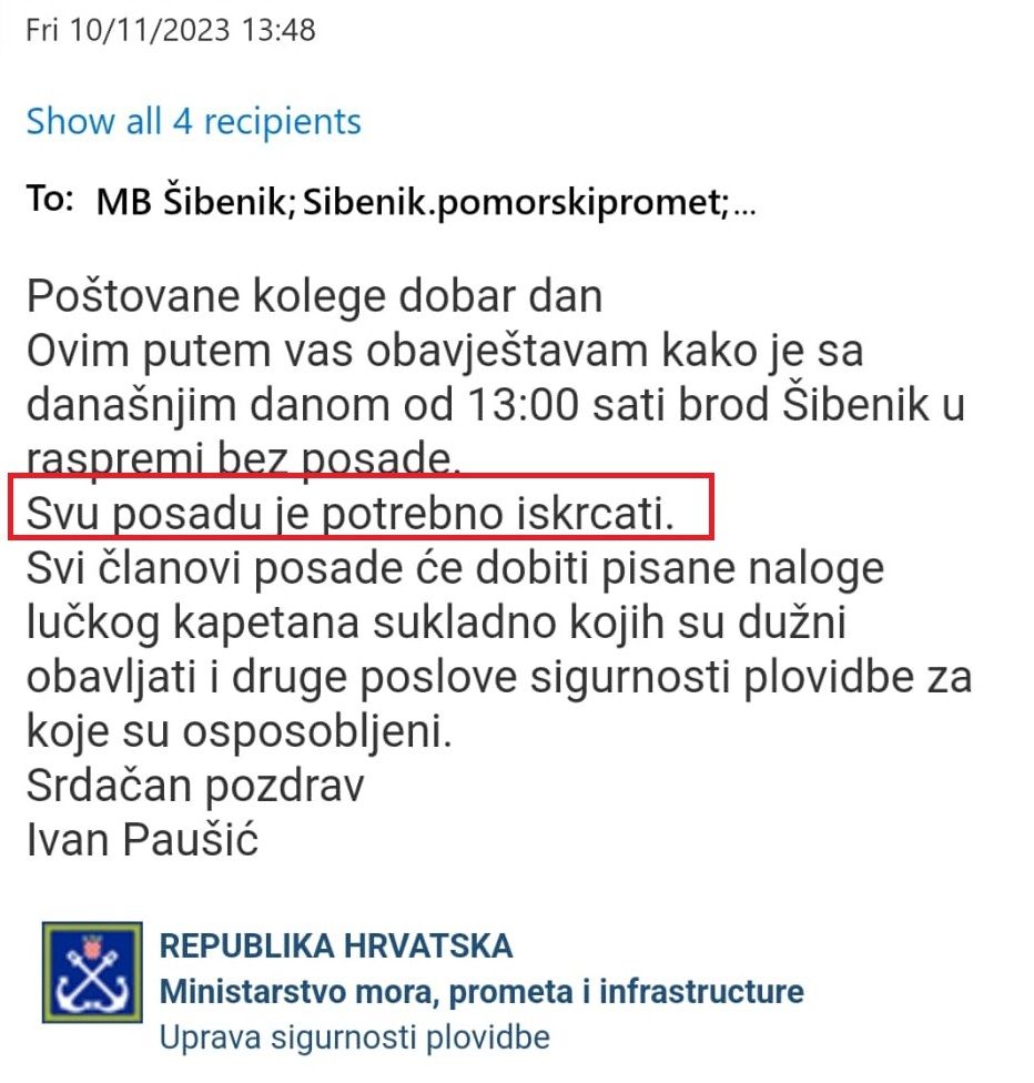 - Zašto bi posada Šibenika uopće išla na nove brodice, jer je obećano da će se jednim djelatnikom zamijeniti članovi posade koji su na godišnjem odmoru a koji uskoro dolaze na posao. Za isti također postoji zapis. Uz to članovi posada brodova u Lučkim Kapetanijama imaju rješenja, gdje piše da rade na brodu. Sami natječaji glase "RAD NA BRODU" gdje je posada dužna boraviti 24 sata dnevno - pojašnjavaju nam i pitaju se: "Zašto uprava ide protiv pravilnika koji je sama donijela?"