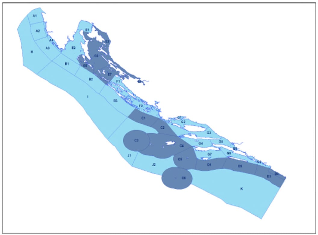 Iznimno, u ribolovnoj zoni E ribolov pridnenom povlačnom mrežom – koćom dozvoljen je u dijelu podzone E1 sjeverno od spojnice: rt Grota na otoku Cresu – rt Pelova na otoku Krku, podzoni E2, s ove karte.