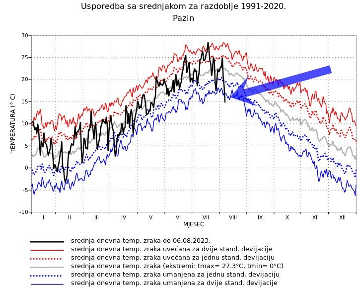 U konkretnom primjeru, prikazan je grafikon za Pazin gdje se jasno vidi kako je u Pazinu početkom kolovoza temperatura odstupala od prosjeka 1991.-2020. za više od dvije standardne devijacije, što znači da je bilo ekstremno hladno.