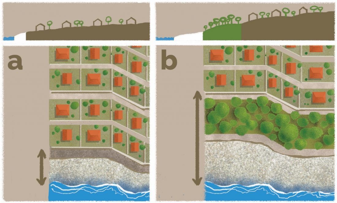 Jedna od takvih integralnih mjera je i uspostava obalnog odmaka, odnosno obalnog područja u kojem su neke ili sve vrste gradnje zabranjene ili značajno ograničene. Obalni odmak osigurava zaštitu obale smanjenjem broja nekretnina (npr. stambenih zgrada, infrastrukture i poslovnih prostora) u područjima osjetljivim na opasnosti za koje se očekuje da će s klimatskim promjenama postajati sve ozbiljnije (obalne poplave i erozija).
