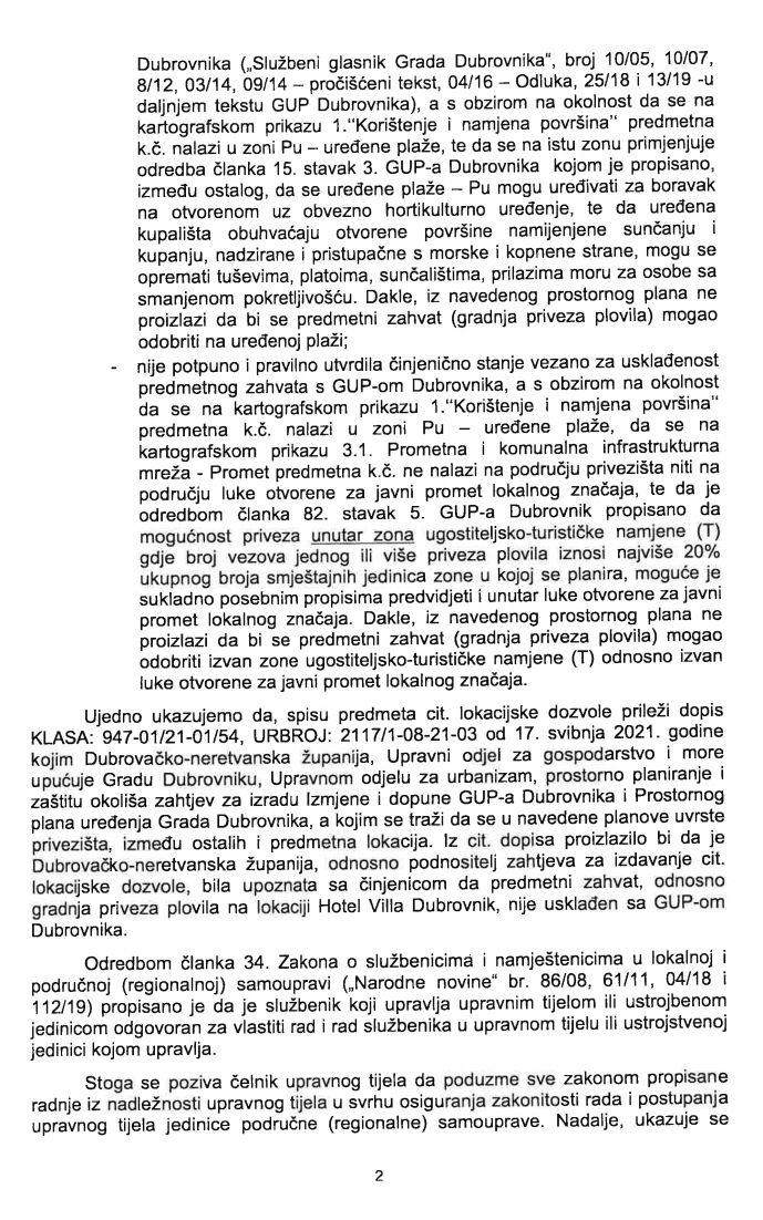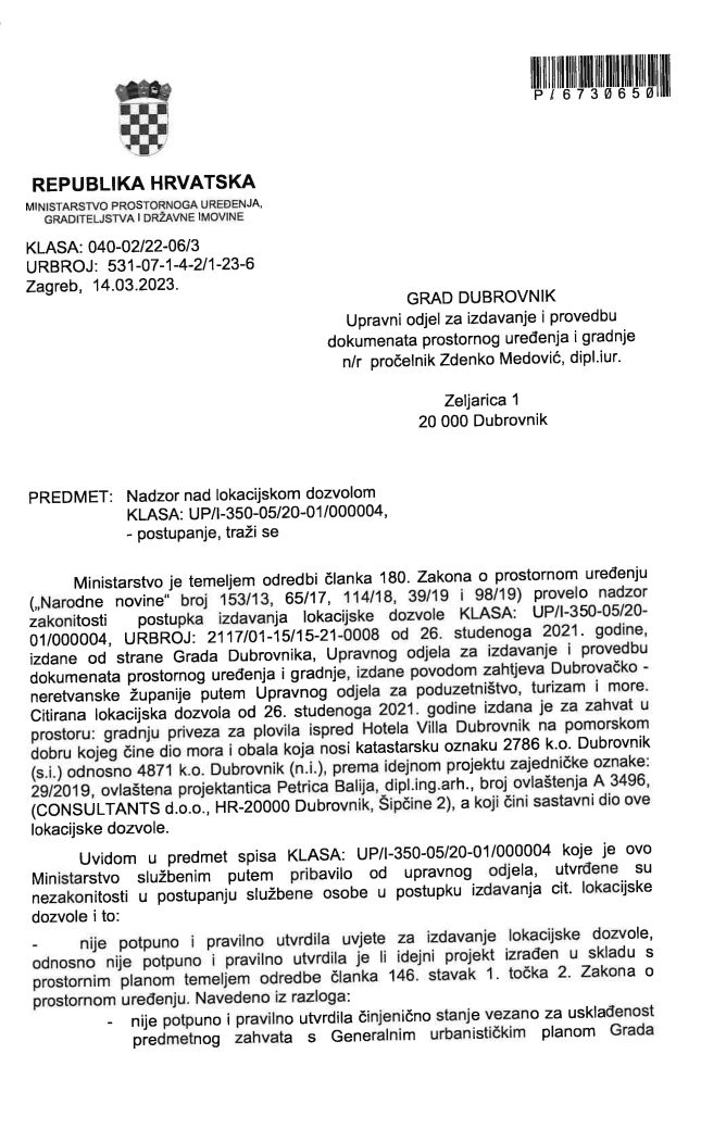 DUBROVNIK - Ministarstvo prostornog uređenja, graditeljstva i državne imovine upozorilo je Upravni odjel za izdavanje i provedbu dokumenata prostornog uređenja i gradnje Grada Dubrovnika zbog protuzakonitog izdavanja lokacijske dozvole u studenom 2021. godine za gradnju priveza za plovila ispred Hotela Villa Dubrovnik. U dokumentu, kojeg imamo u posjedu i objavljujemo, odjelu, odnosno njegovom šefu Zdenku Medoviću se vrlo jasno naređuje da postupi po zakonu. Nazvali smo ga i pitali, zašto je uopće njegov odjel izdao protuzakonit akt?