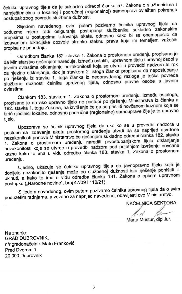 "Uvidom u predmet koje je ovo Ministarstvo službenim putem pribavilo od upravnog odjela, utvrđene su nezakonitosti u postupanju službene osobe u postupku izdavanja citirane lokacijske dozvole", stoji u dokumentu kojeg je još u ožujku ministarstvo uručilo Gradu Dubrovniku, a kojeg je u posjedu Morski HR i ovim putem ga objavljujemo.