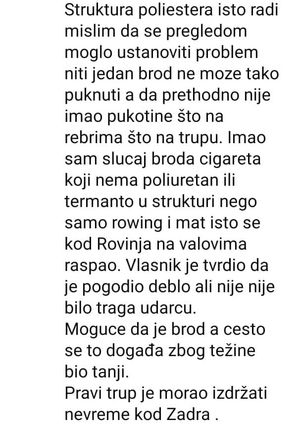 - Struktura poliestera isto radi. Mislim da se pregledom moglo ustanoviti problem. Niti jedan brod ne može tako puknuti, a da prethodno nije imao pukotine, što na rebrima, što na trupu. Imao sam slučaj broda cigareta, koji nema poliuretan ili termanto u strukturi nego samo rowing i mat, isto se kod Rovinja na valovima raspao. Vlasnik je tvrdio da je pogodio deblo, ali nije bilo ni traga udarcu! Moguće da je brod, a često se to događa, zbog težine bio tanji. Pravi trup je morao izdržati do Zadra - kaže.
