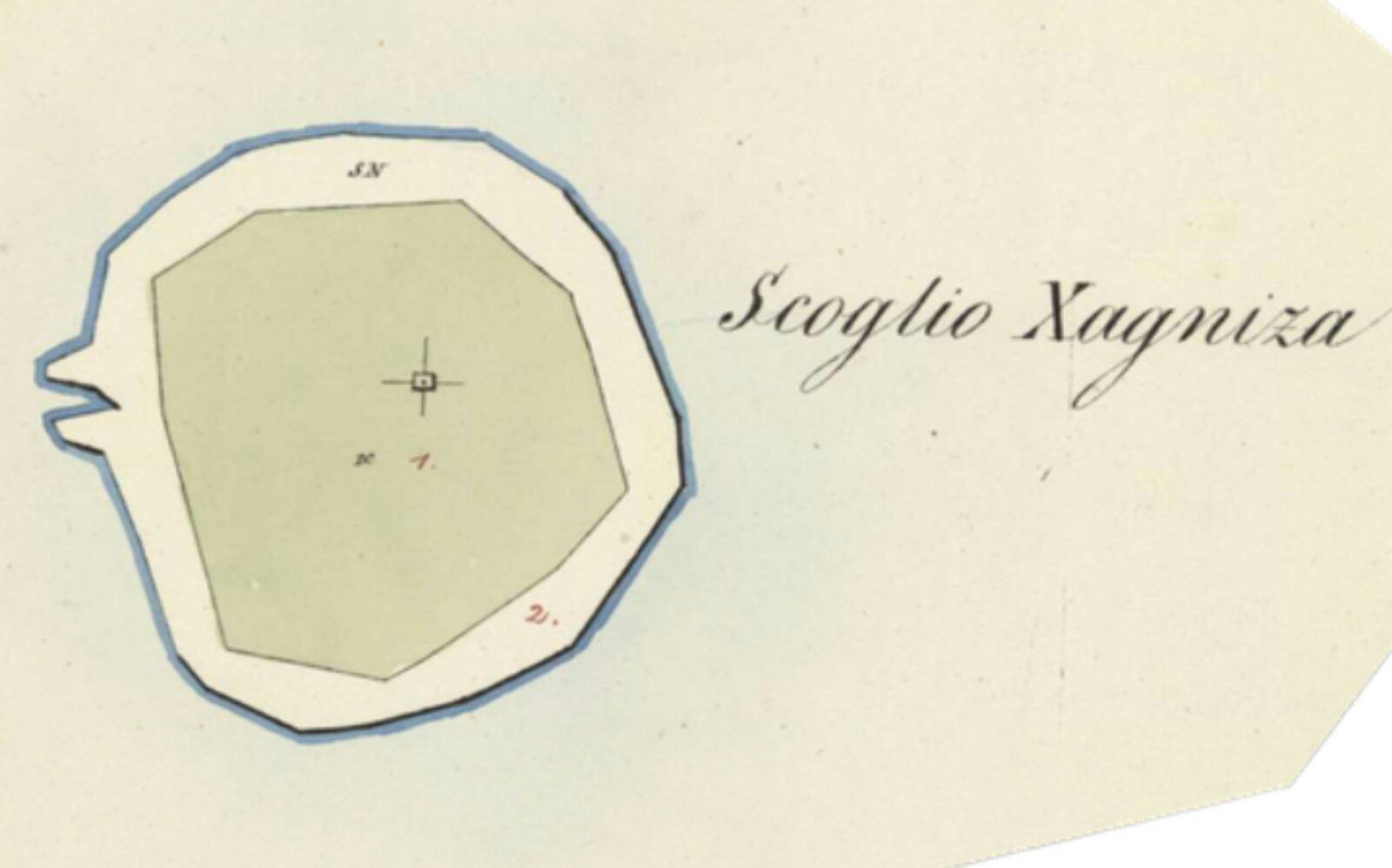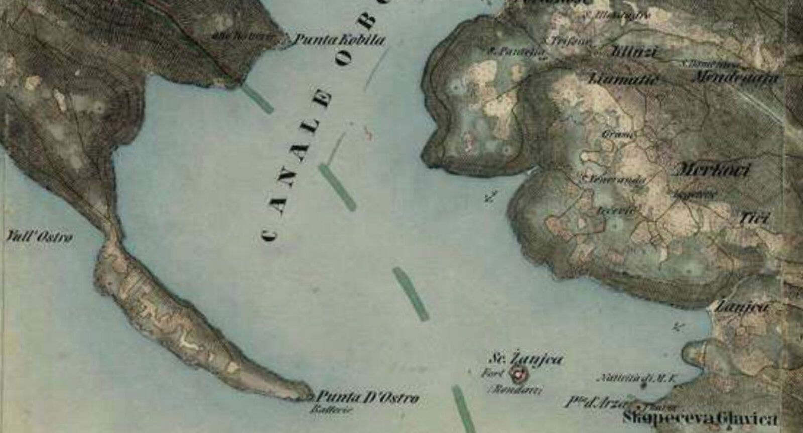 Dalje, na detalju topografske karte Dalmacije iz 1869., uočljiva je zelena (isprekidana) linija, ucrtana na moru, koja polazi od rta Konfin (tadašnja kopnena granica između Austrougarske monarhije i Osmanskog sultanata) i nastavlja se između ponte Oštro (punta d’Ostro) i otoka Lastavica (Žanjica ili Rondón) i usmjerena je prema otvorenom moru.