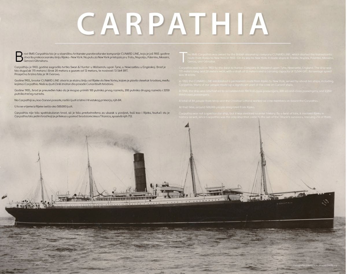 Za Riječane, ovaj brod ima dublje i osobnije značenje jer je bio poveznica našega grada s ostatkom svijeta. Mnogi naši sugrađani otisnuli su se u nepoznati svijet tražeći bolji život, a Carpathia je bila nada koja ih je na tom putu i vodila.