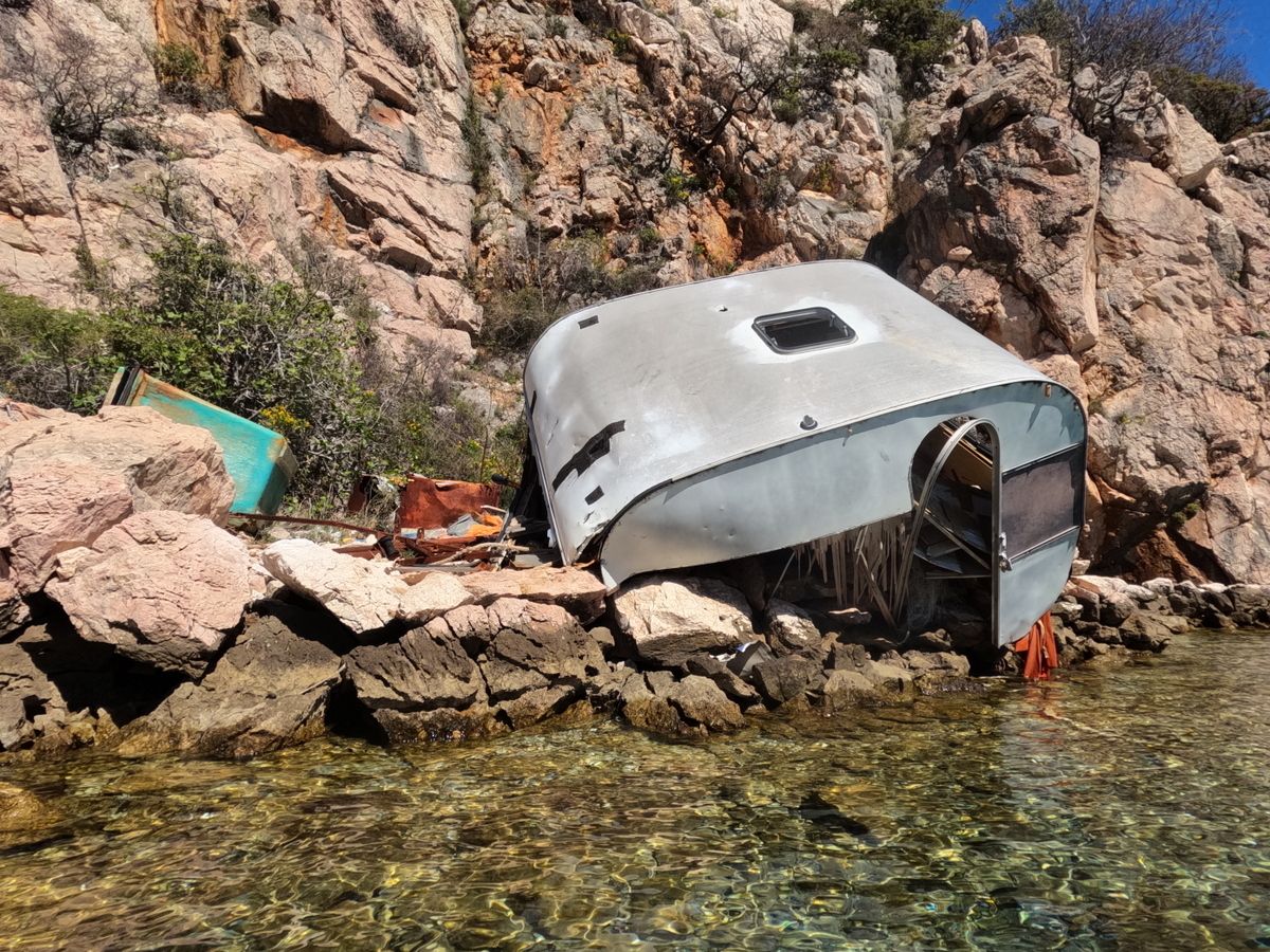 Nema niti ceste koja vodi na rub litica pa da je netko bacio ovu kamp kućicu, tako da je jedini zaključak transport prikolice nekakvim brodom, te postavljanje iste na stijene. Na žalost je očito bilo neko gadno nevrijeme pa je kućica bila uništena od strane valova.