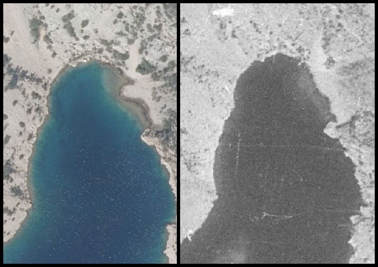U dnu uvale na lijevoj slici (u boji) možete primjetiti nekakav jezičak od "plaže" kojeg nema na slici desno (crno-bijela) - opisuje Marko Kovač.