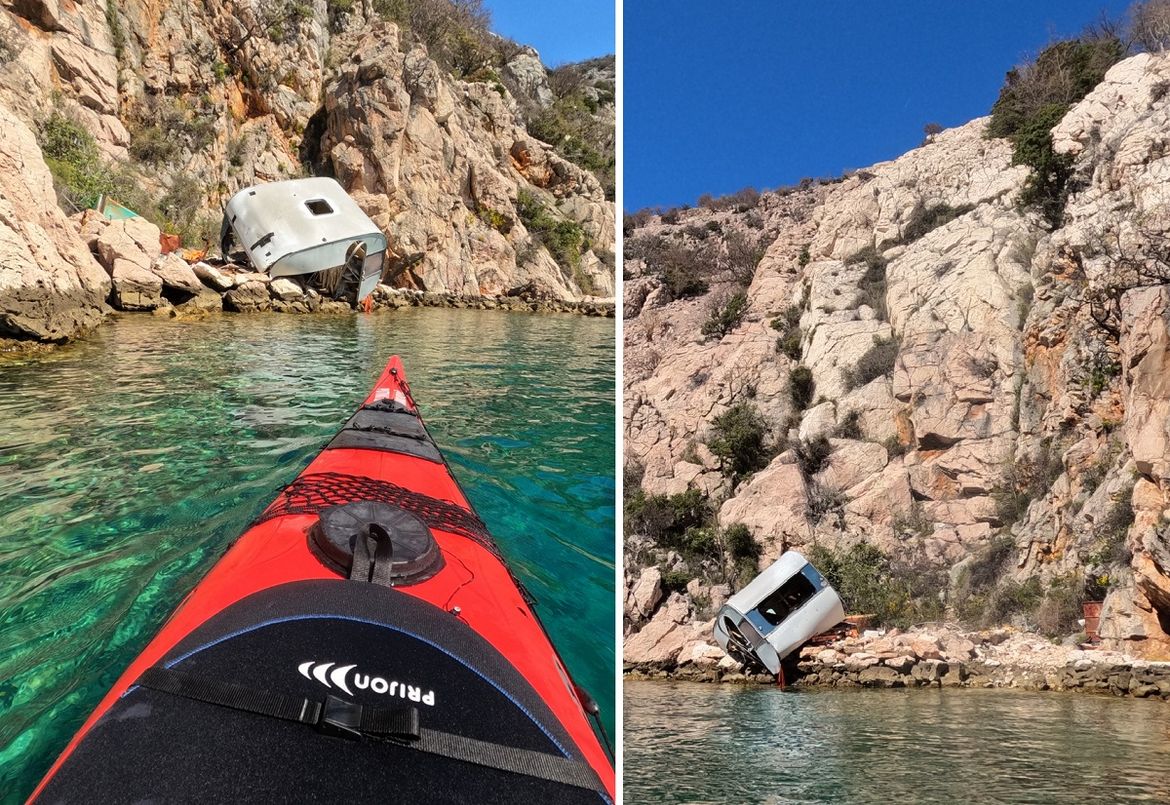 Nema niti ceste koja vodi na rub litica pa da je netko bacio ovu kamp kućicu, tako da je jedini zaključak transport prikolice nekakvim brodom, te postavljanje iste na stijene. Na žalost je očito bilo neko gadno nevrijeme pa je kućica bila uništena od strane valova.