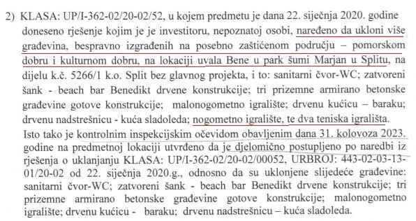 Teniski i nogometni tereni još od 2020. godine imaju pravomoćna rješenja o uklanjanju koja se godinama ignoriraju. Danas imamo povijesnu priliku ispraviti grijehe prošlosti i vratiti prirodi ono što joj je ljudska pohlepa uzela. Naš zahtjev je jasan: Uklonimo ilegalni beton i posadimo nova stabla na cijelom devastiranom području. Vratimo Bene prirodi, a ne onima koji su je pretvorili u izvor nelegalnog profita - poručili su iz splitskog Društva Marjan.