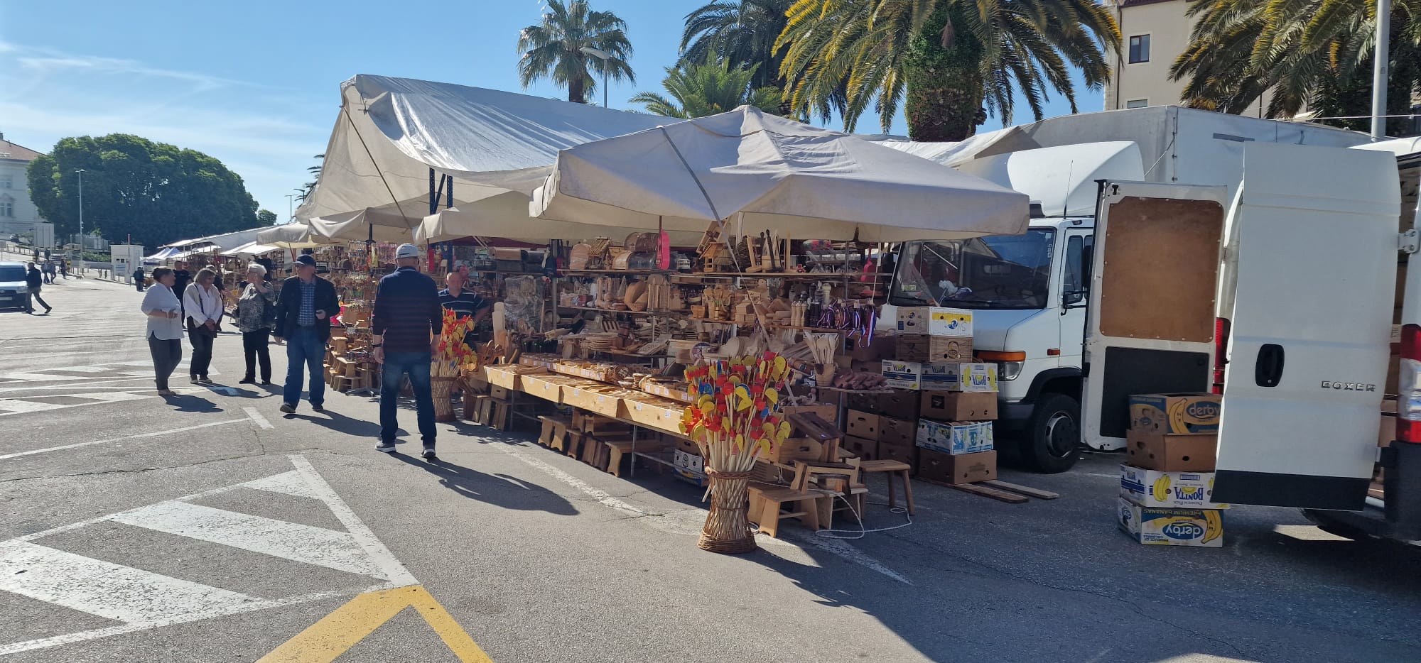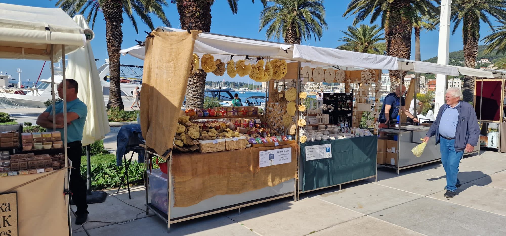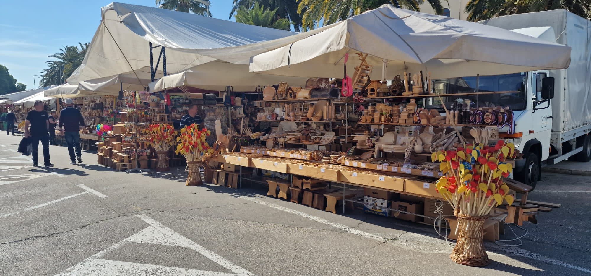 Štandovi na Rivi puni su prigodnih suvenira, raznih drvenih predmeta, rukotvorina te proizvodi domaćih OPG-ova. Stari meštri od drva opet su dobili priliku prezentirati svoje proizvode, među kojima i ptice klepetuše, drvene igračke koje se najviše vežu upravo uz feštu sv. Dujma.
