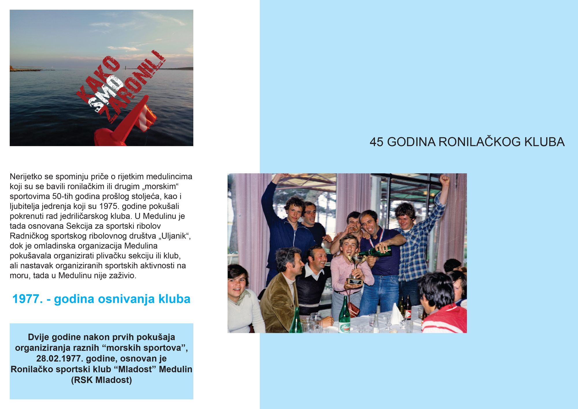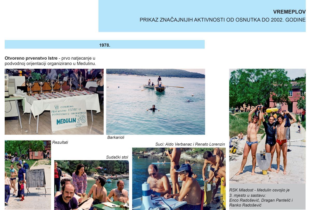 Uz kratak prikaz Medulina iz šezdesetih i sedamdesetih godina prošlog stoljeća knjiga opisuje nastanak ronilačkog kluba i prati organizacijske promjene od 1977. do 2022. godine, s opisom nastanka i rada Pomorskog društva „Mladost – Medulin“ i klubova RK Centar, EKO MORE, RSK Mladost i KSR Medulin. Prikazuje i interakciju kluba sa naseljem i mještanima te bilježi i dokumentira doprinos ronioca u izgradnji medulinske rive, zgrade općinske uprave, sudjelovanje u Domovinskom ratu, pronalasku podmorskih arheoloških nalaza i razvoju pomorskih sportova te aktivnostima čišćenja podmorja Medulinskog arhipelaga.