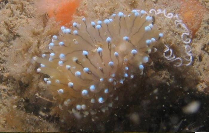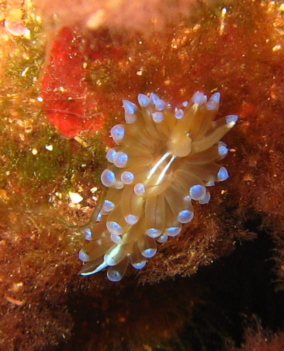 Ova vrsta puža karakteristična je po brojnim narančastim izdancima (ceratama) plavičastih vrhova koji se pružaju iz cijelog tijela. Ipak, za razliku od nekih drugih vrsta stražnjoškržnjaka, ovaj puž ne posjeduje sposobnost preuzimanja žarnih stanica iz žarnjaka kojima se hrani, budući da su mu hrana uglavnom mahovnjaci iz rodova 𝐴𝑐𝑦𝑜𝑛𝑖𝑑𝑖𝑢𝑚, 𝐵𝑢𝑔𝑢𝑙𝑎, 𝐶𝑒𝑙𝑙𝑎𝑟𝑖𝑎 i 𝐵𝑖𝑐𝑒𝑙𝑙𝑎𝑟𝑖𝑒𝑙𝑙𝑎, objasnili su s Fakulteta prirodnih znanosti u Puli.
