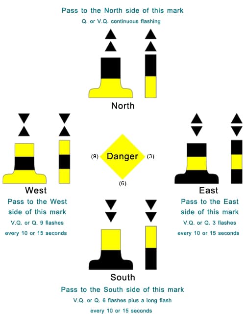 Inače, prema Pravilniku o sustavu obilježavanja plovnih putova i objektima sigurnosti plovidbe, znakom kardinalnog (osnovnog) sustava označavaju se: