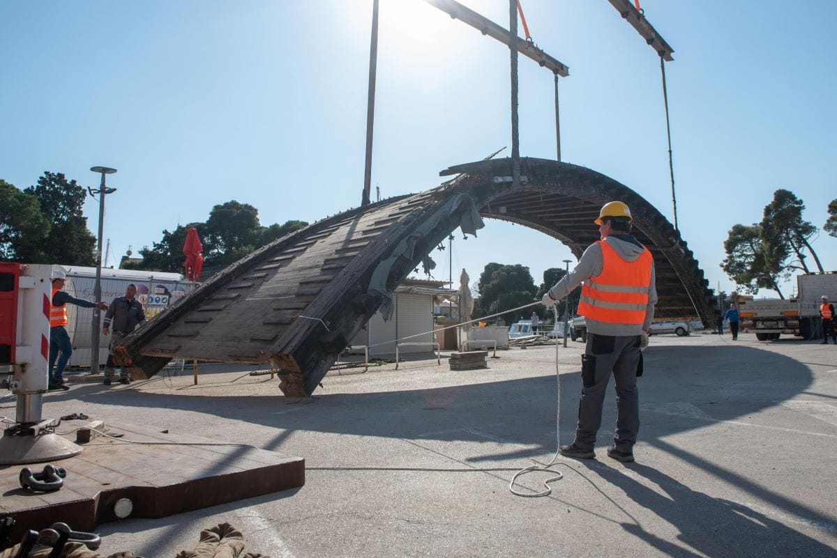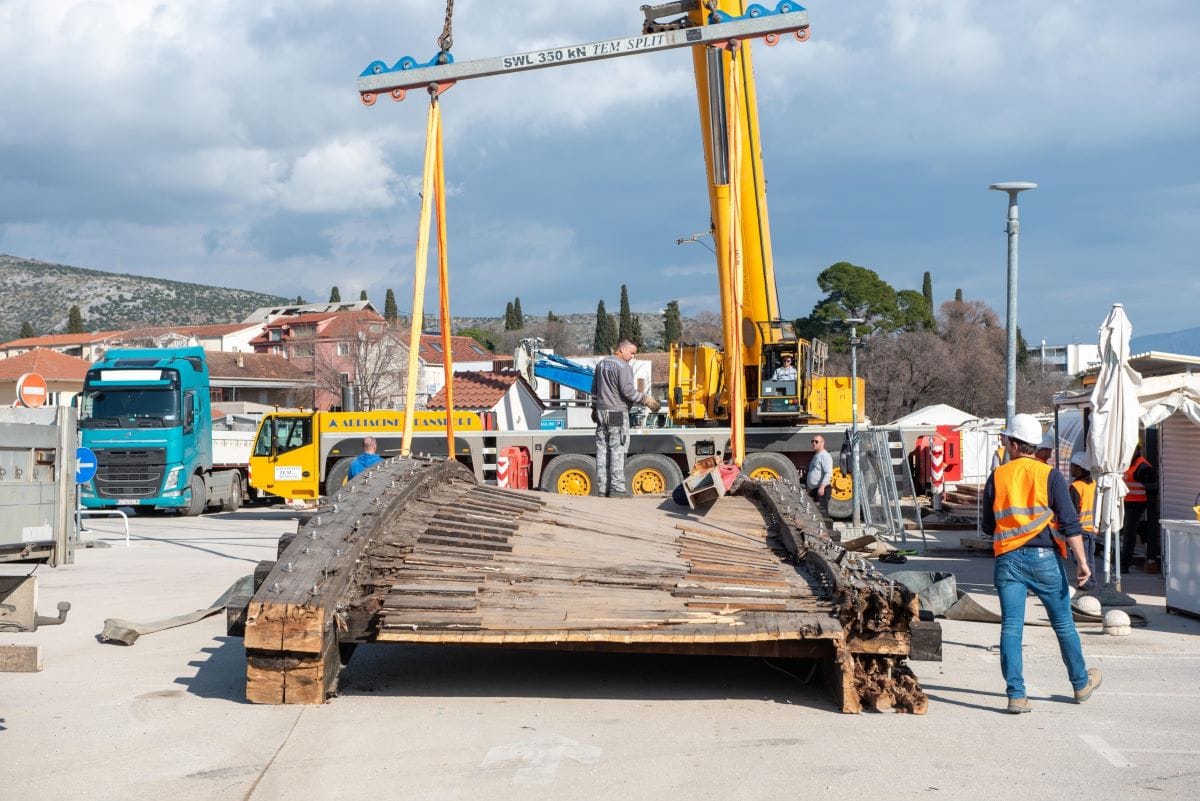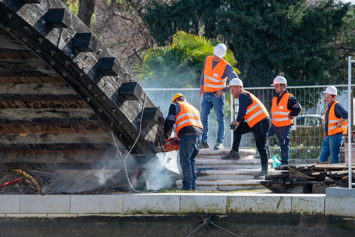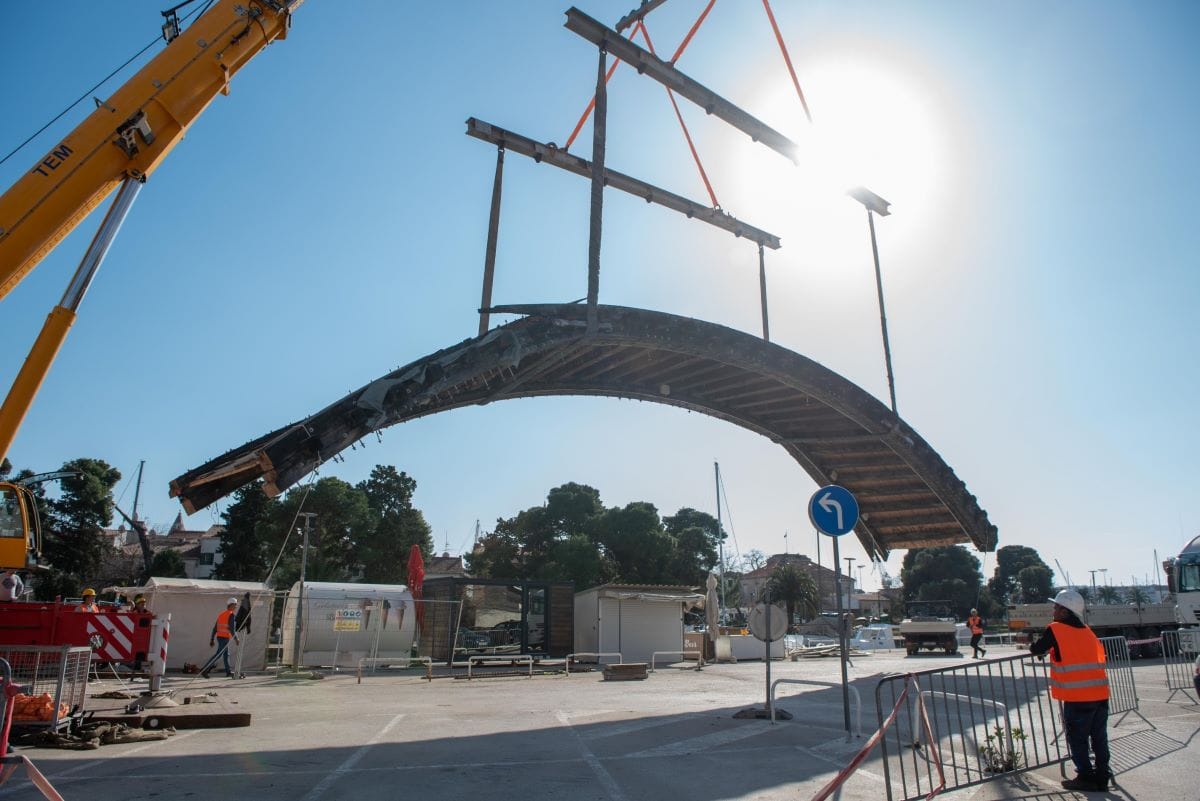 TROGIR - Mjesec dana od početka radova na projektu izgradnje novog pješačkog mosta preko trogirske Foše uklonjena je stara drvena konstrukcija. Pripremne aktivnosti uoči samog uklanjanja trajale su nekoliko sati da bi potom posebnom dizalicom drveni most u gotovo integralnom izdanju bio prebačen na kopno odakle će biti dalje deponiran. Dio drvene građe dat će se Umjetničkoj akademiji u Splitu u svrhe izrade skulptura, a dio će zbrinuti ovlaštena tvrtka.