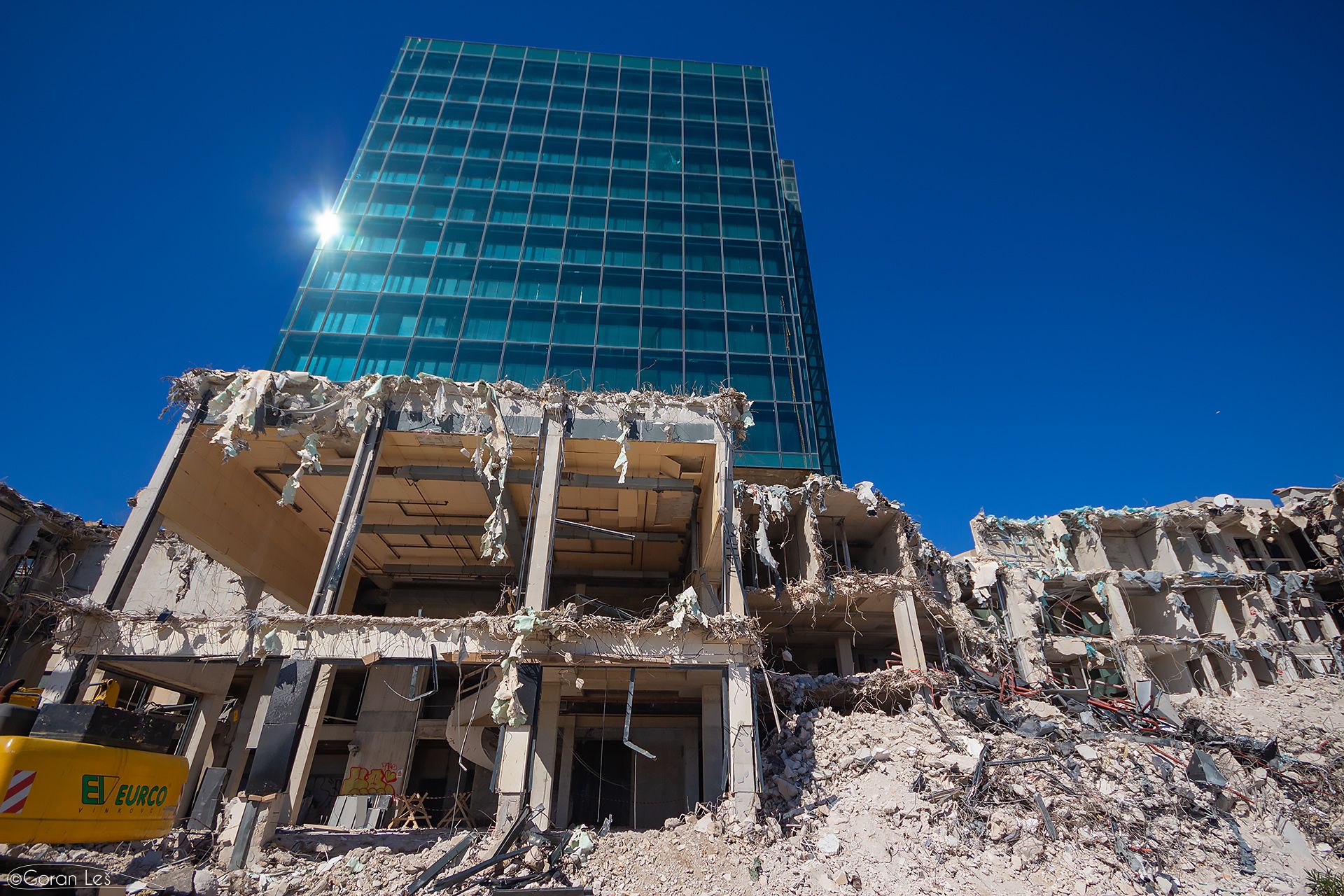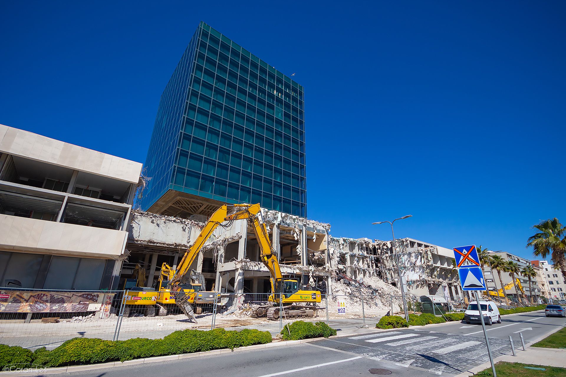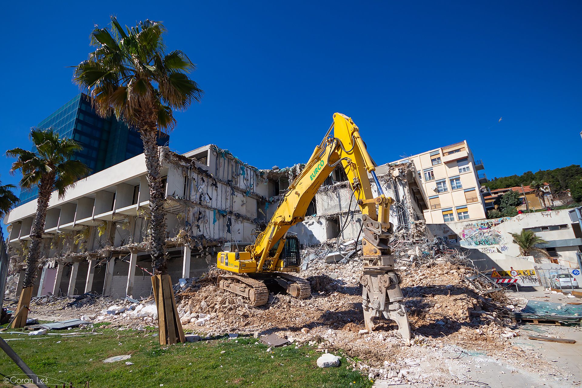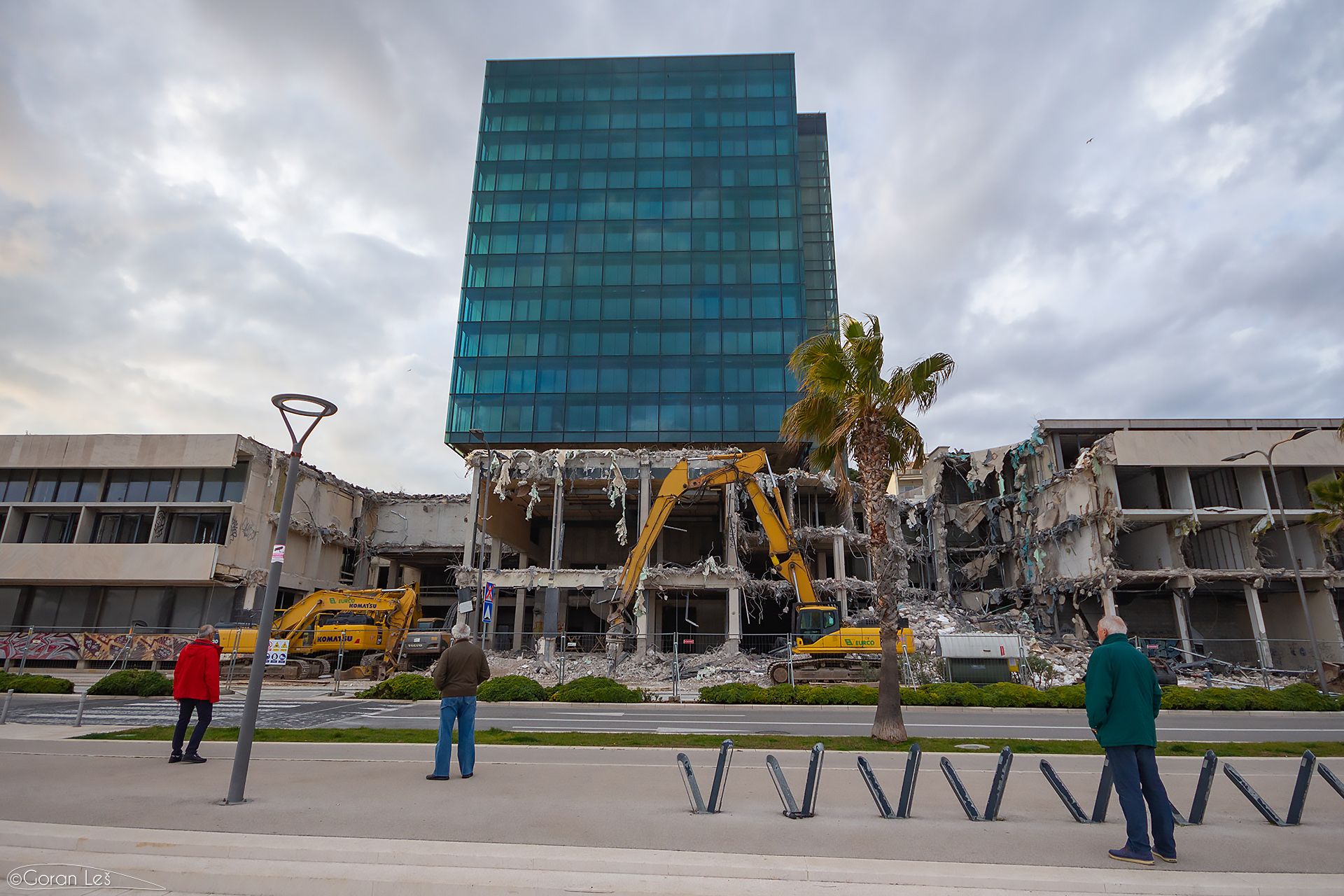 SPLIT - Rušenje jednog od simbola propasti Kerumovog carstva privuklo je neuobičajenu količinu umarella, koji sa zanimanjem promatraju i komentiraju polaganu destrukciju grandioznog zdanja na Zapadnoj obali - objavio je splitski fotograf Goran Leš.